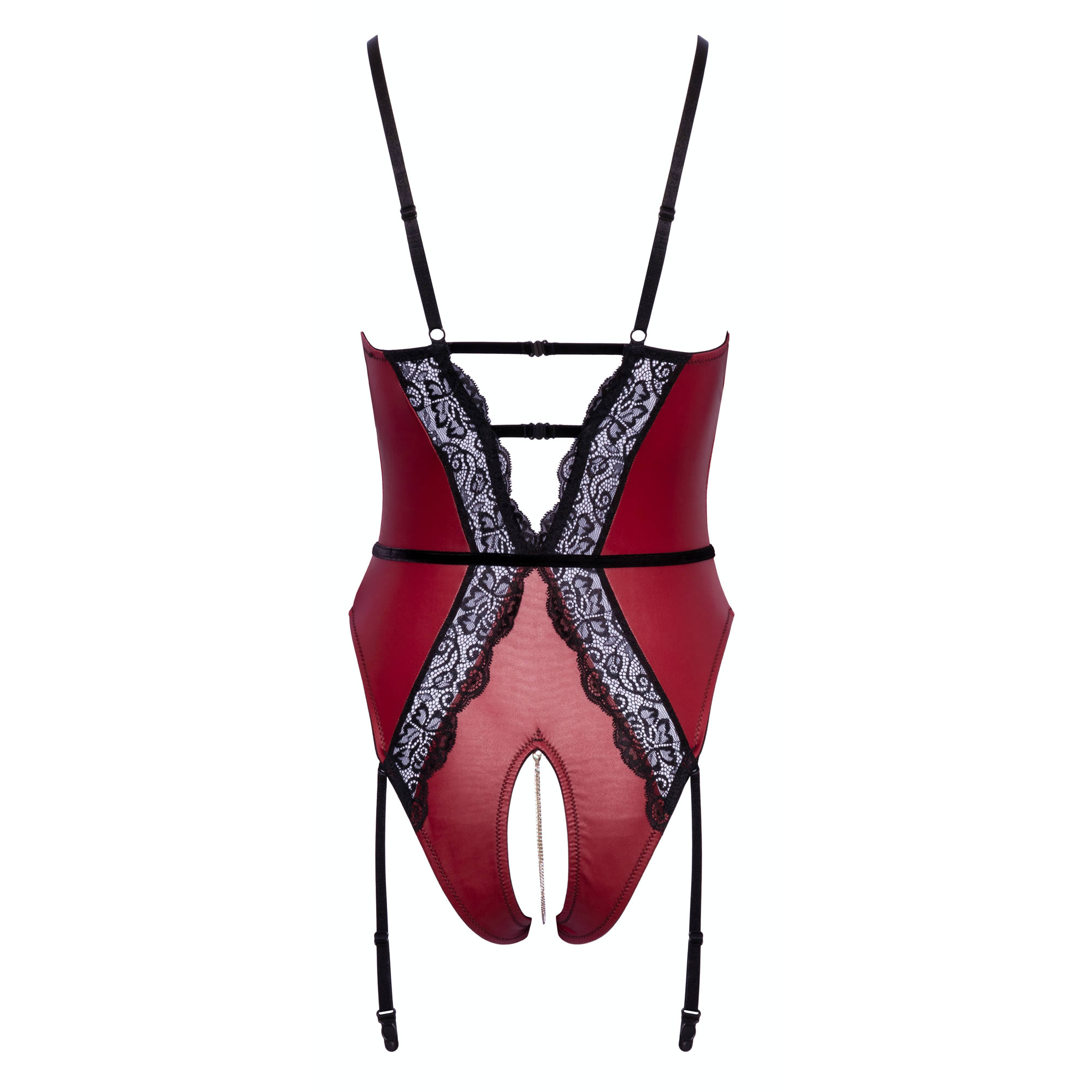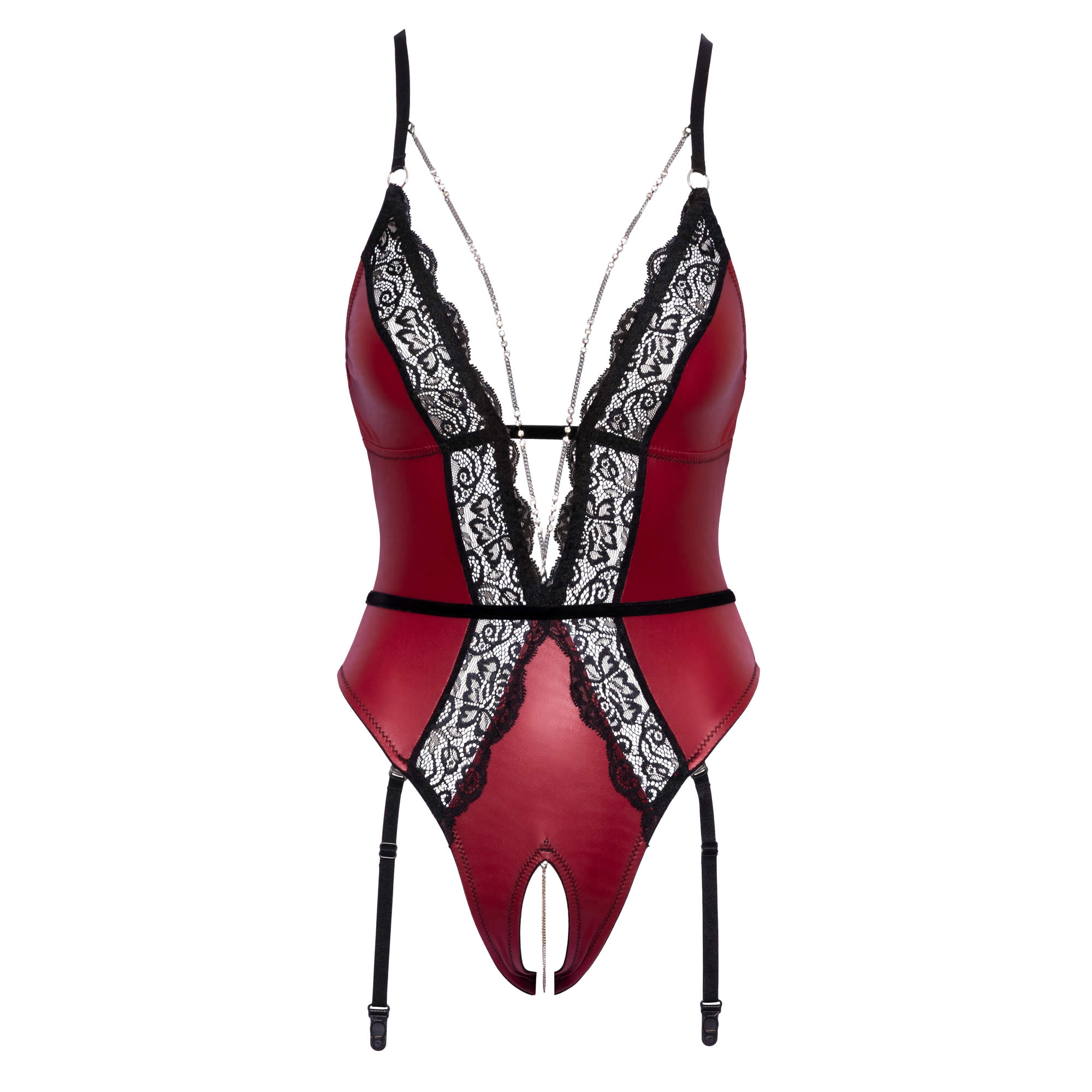Abierta Fina bundløs body med rød wetlook og blonder samt en fræk pirrende kæde.