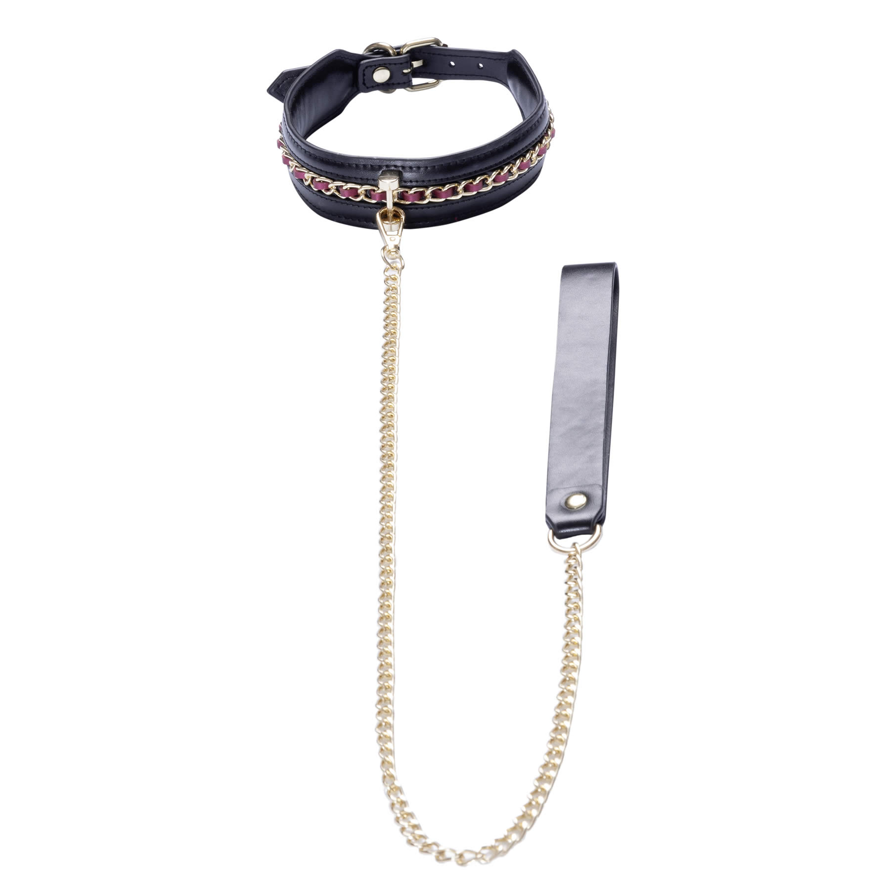Sættet er fremstillet i sort imitation læder af høj kvalitet med røde detaljer og guldfarvede metalelementer, hvilket giver et luksuriøst og udfordrende look. Hver del er gennemtænkt designet til ikke blot at være smuk at se på, men også komfortabel, funktionel og justerbar for den perfekte pasform. Spænderne gør det nemt at tilpasse manchetter og halsbånd, mens de aftagelige kæder med karabinhager giver fleksibilitet under legen.