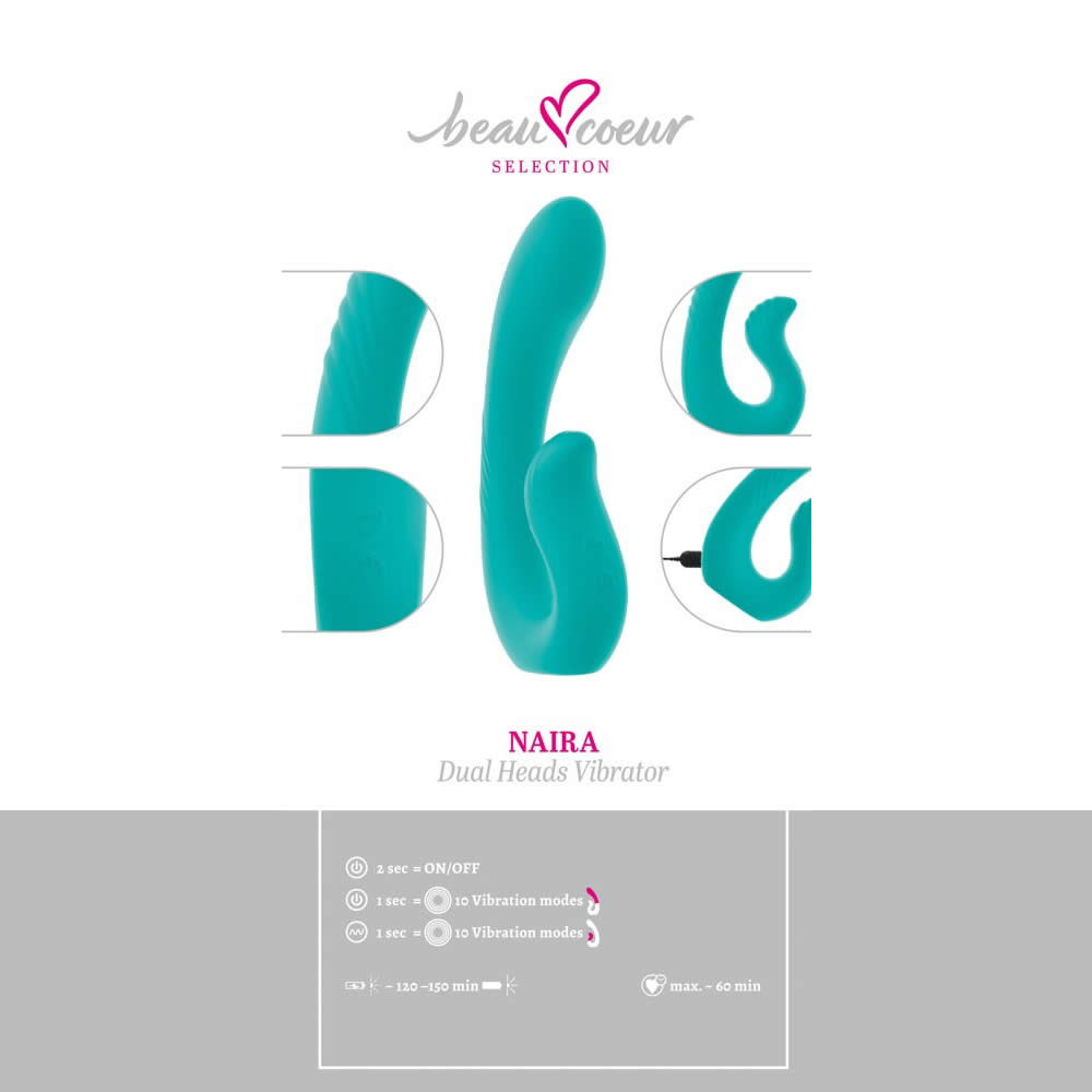 Udstyret med to stille men kraftfulde motorer, én i hvert hoved. Disse giver NAIRA mulighed for at stimulere flere erogene zoner samtidig. Hver motor har 10 vibrationsprogrammer, som kan styres separat eller kombineres for en helt personlig oplevelse. Uanset om den bruges vaginalt eller analt, tilpasser denne dobbelt-action vibrator sig perfekt til kroppen, så hver vibration rammer præcis de rigtige steder. De blide teksturer forstærker fornemmelserne og gør hvert øjeblik endnu mere pirrende.