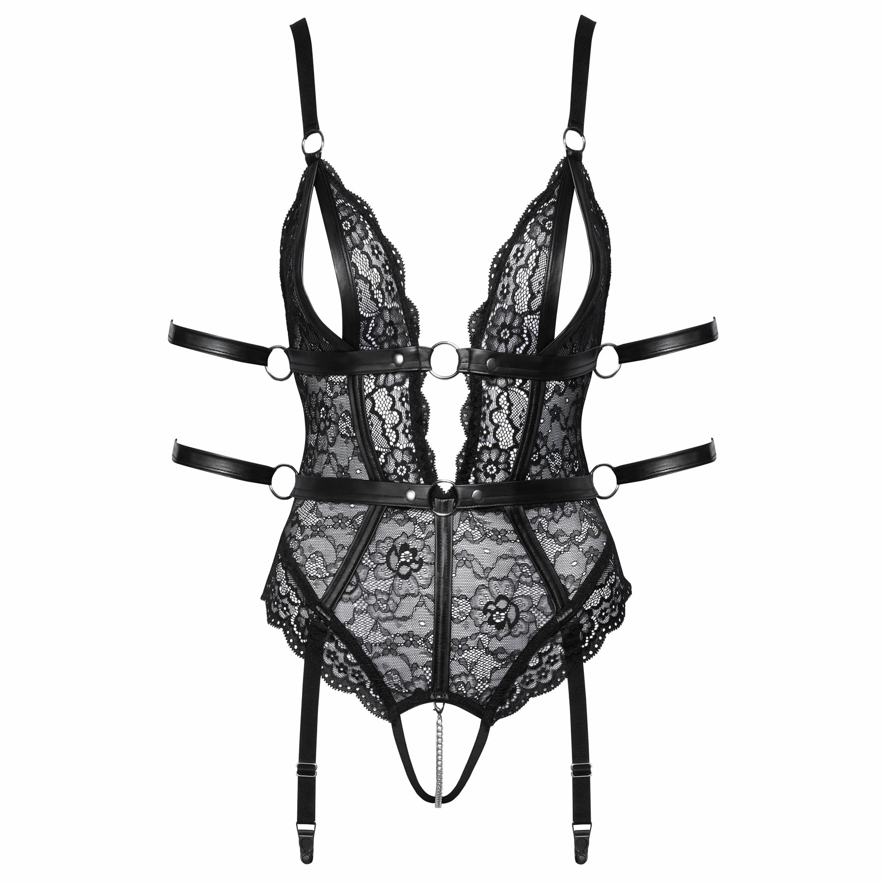 Designet inkluderer provokerende slidser i de bløde skåle, hvilket øger den sensuelle appel. Bælterne, der løber under brystet og rundt om taljen, har dekorative ringe, som er perfekte til bondage-leg og tilføjer et kantet twist til det samlede look.