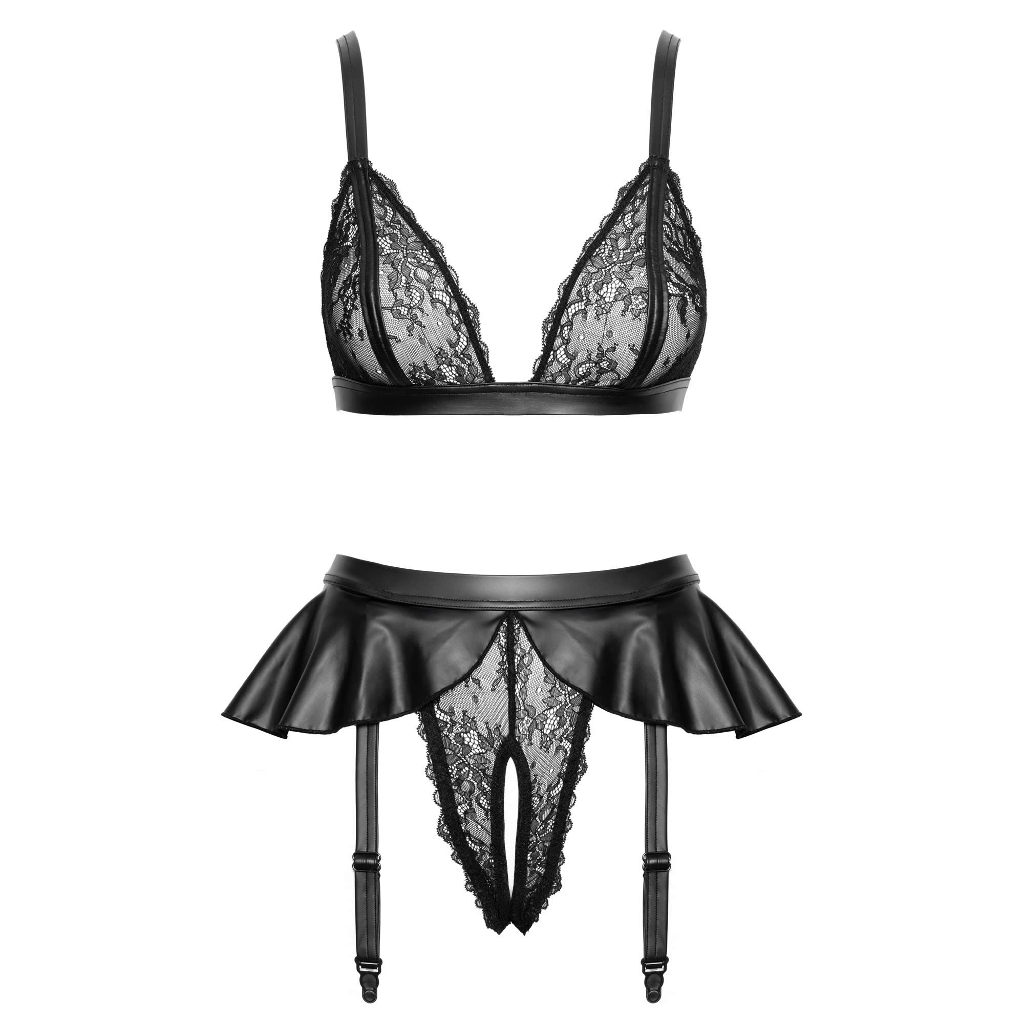De matchende bundløse hofteholdertrusser er skabt til at forføre. Et wetlook mini skirt er påsyet den elastiske talje, hvilket tilfører et legende og dristigt twist til klassisk blonde-lingeri. De justerbare og aftagelige hofteholderstropper giver mulighed for tilpasning, mens den bundløse detalje gør sættet både frækt og uimodståeligt. Kombinationen af blonde og matte wetlook-materialer skaber en luksuriøs kontrast, som fremhæver sættet fra alle vinkler.