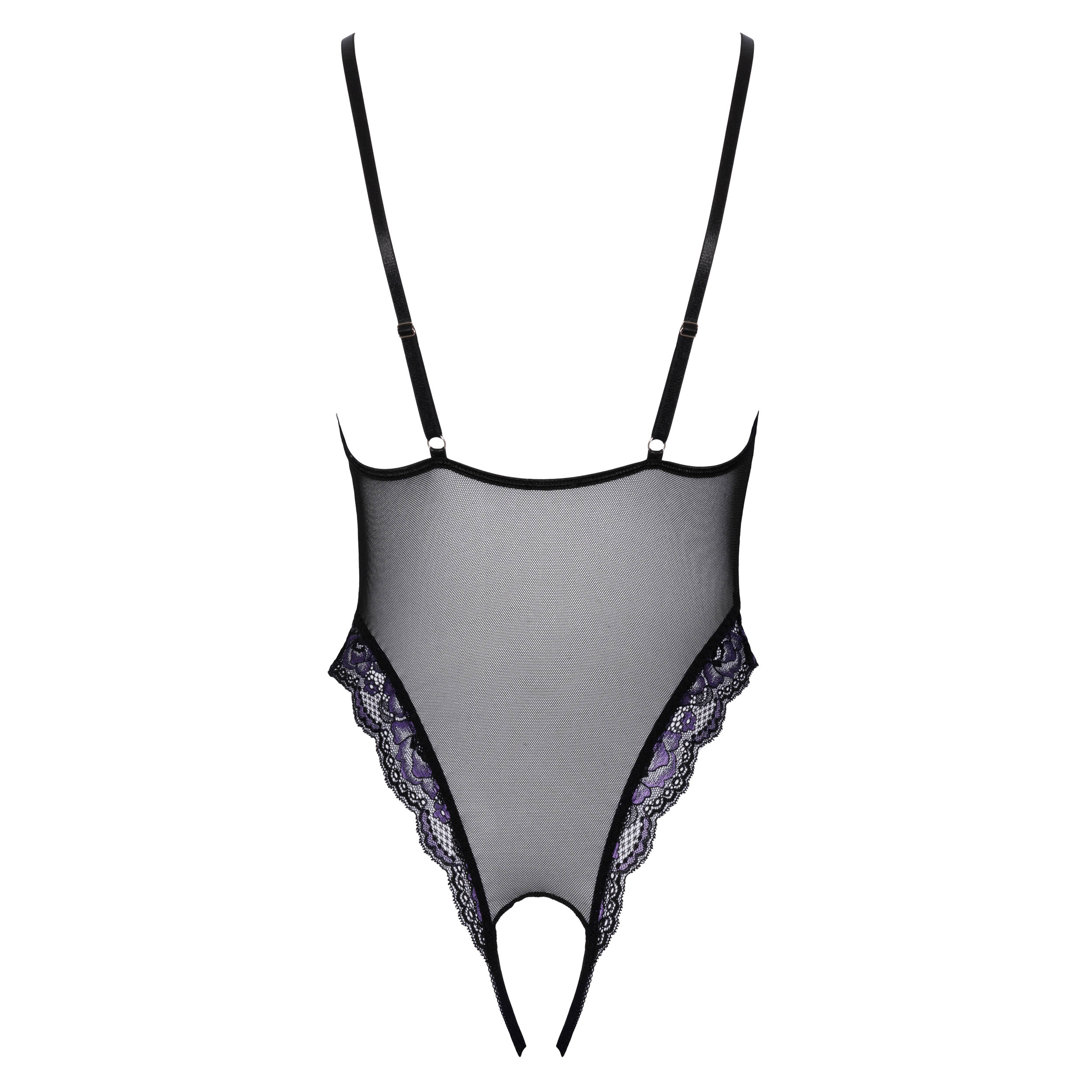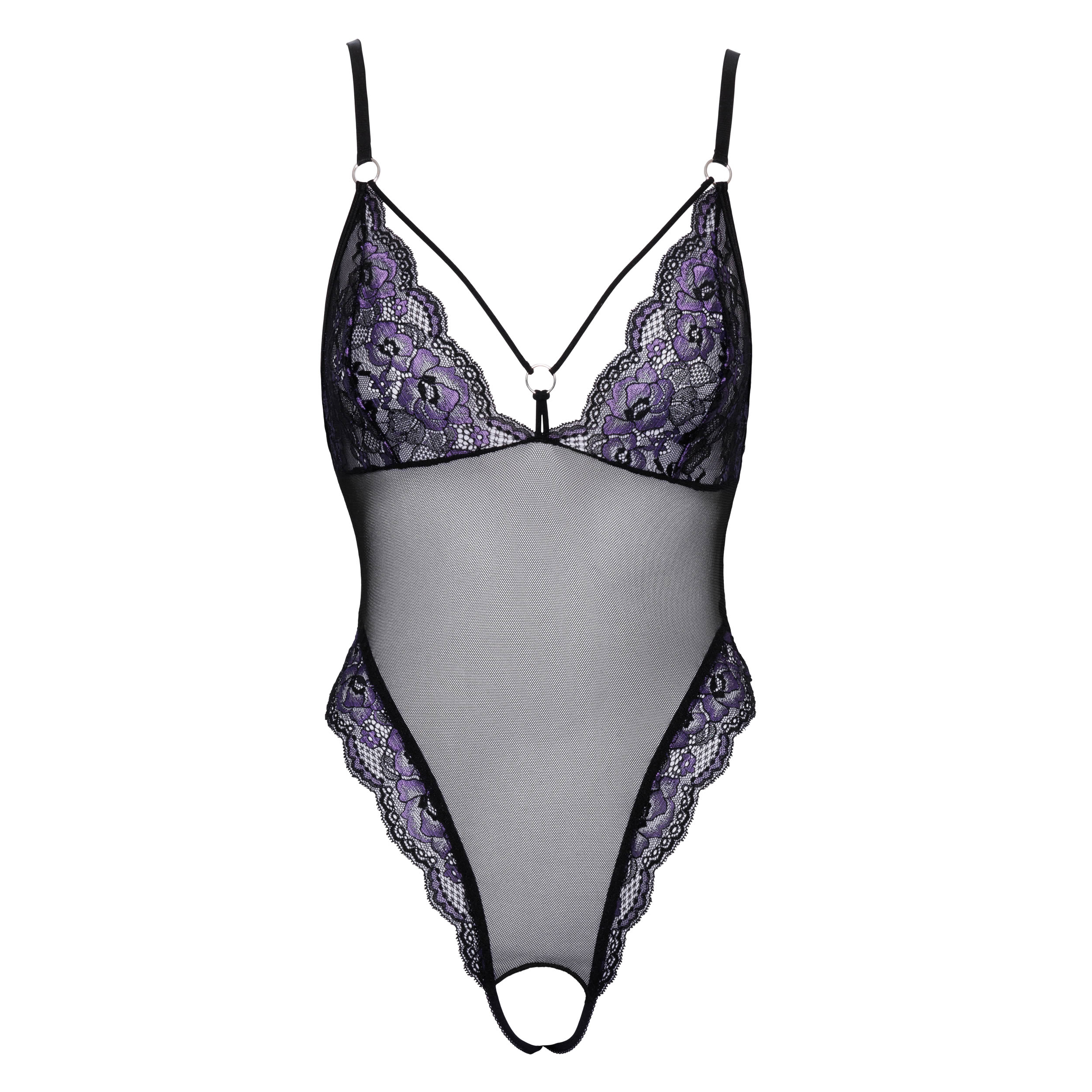 Elegant bundløs blonde body i et mix af sorte og lilla blonder!