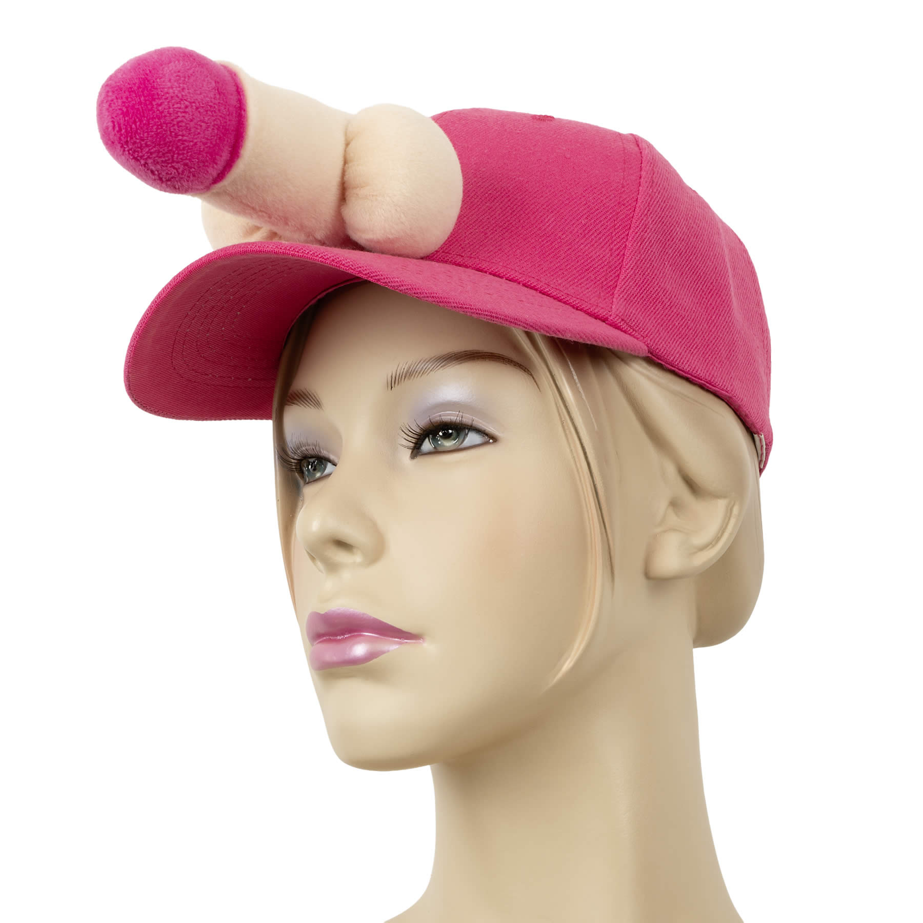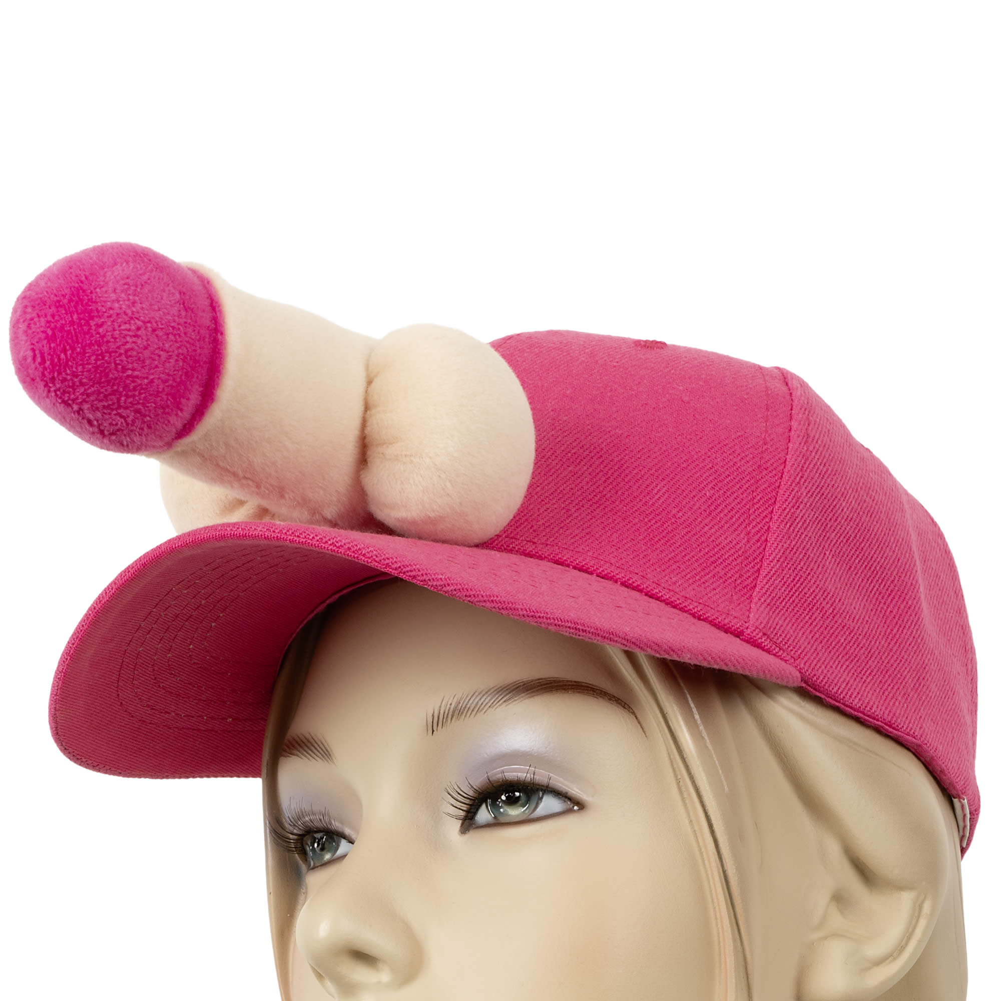 Den lyserøde baseballkasket har en stor, blød og tydelig plys-penis med tilhørende testikler, som sidder stolt lige over skyggen. Fremstillet af fløjlsblødt polyester, er de bløde detaljer både faste nok til at holde formen og sjove at røre ved. Den hudfarvede kontrastfarve gør udtrykket endnu mere komisk og sørger for, at kasketten skiller sig ud i mængden.