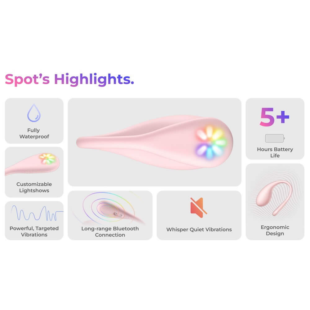 Fremstillet i silkeblød silikone føles Spot lækker mod huden og giver en behagelig og sikker pasform, når den bæres. Det kurvede og fleksible design tilpasser sig kroppen og giver fri bevægelighed, mens vibratoren bliver siddende, hvor den skal. Den er helt vandtæt, så du kan tage den med i bad eller spa og udvide legen til nye rammer. Med en stabil Bluetooth-forbindelse og en batterilevetid på over 4 timer er Spot klar til nydelse uden afbrydelser.