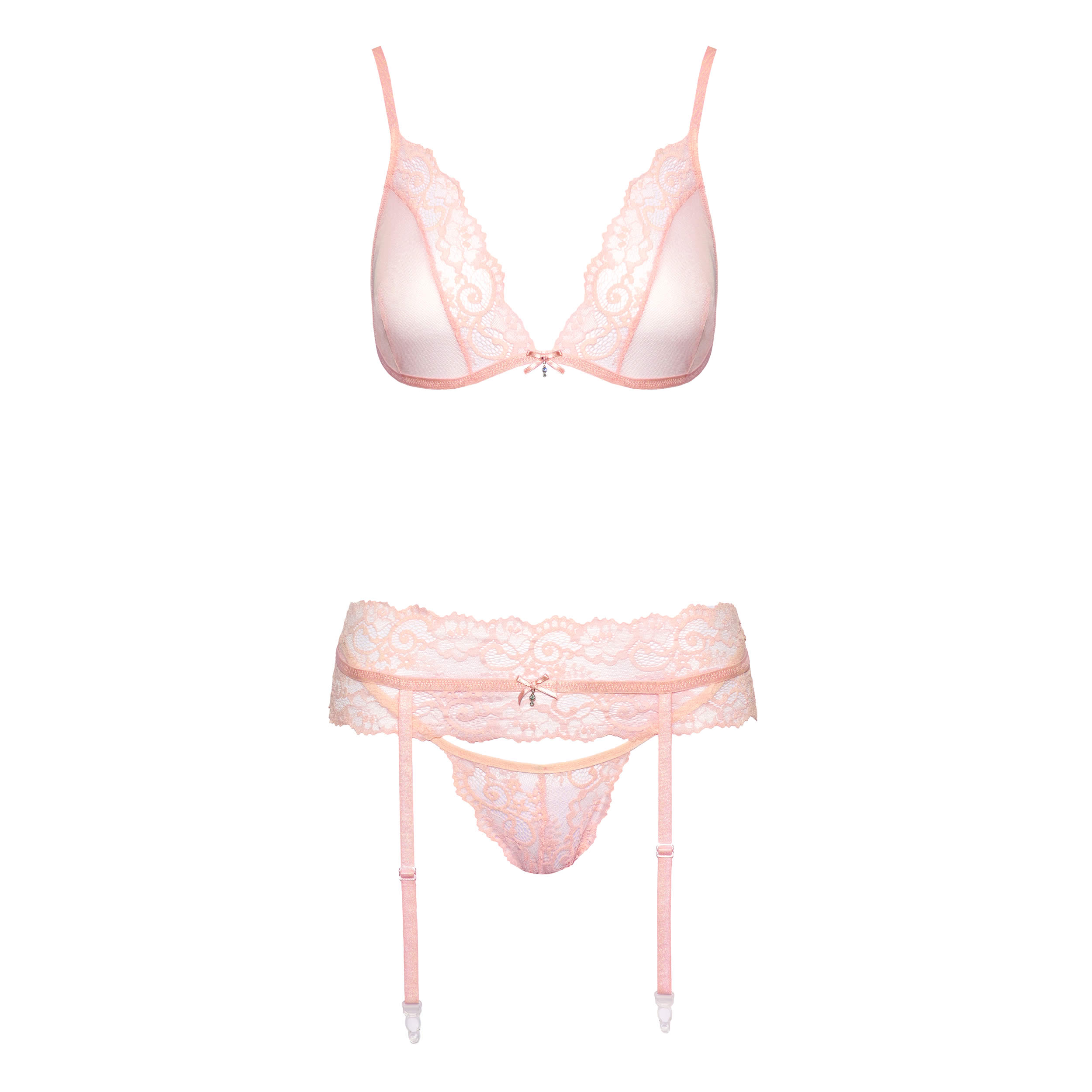 Kissable lingeri sæt i rosa med soft bh, hofteholder og g-streng. Materialet er et mix af fin tyl og raffinerede blonder.