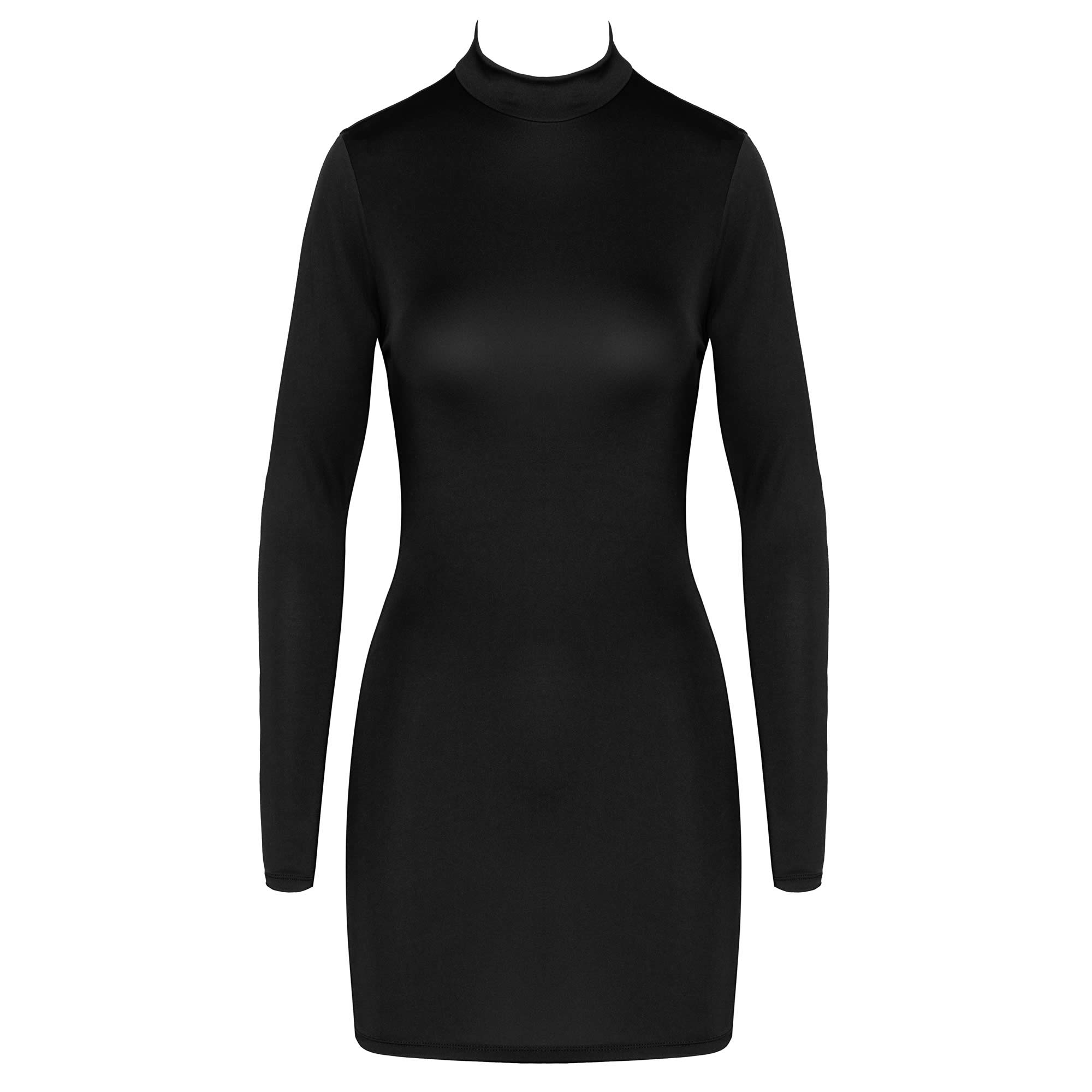 Fra fronten udstråler kjolen elegance med sine rene linjer, lange ærmer og den tætsiddende, tilspidsede pasform. Det bløde, elastiske materiale sikrer en behagelig, kropsnær pasform, der føles komfortabel hele aftenen. Den stående krave tilføjer et sofistikeret touch og kan lukkes bagpå med to messingfarvede trykknapper, hvilket giver halsudskæringen et poleret finish.