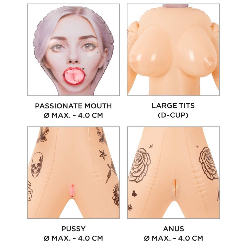 Lolita Dukke med Tatoveringer er den perfekte ledsager til alle, der ønsker en realistisk, visuelt imponerende og alsidig oppustelig sexdukke. Hendes frække tatoveringer, faste bryster og flere nydelseshuller sikrer uforglemmelige solo- eller partneroplevelser, hvilket gør hende til et must-have for fans af oppustelige dukker.