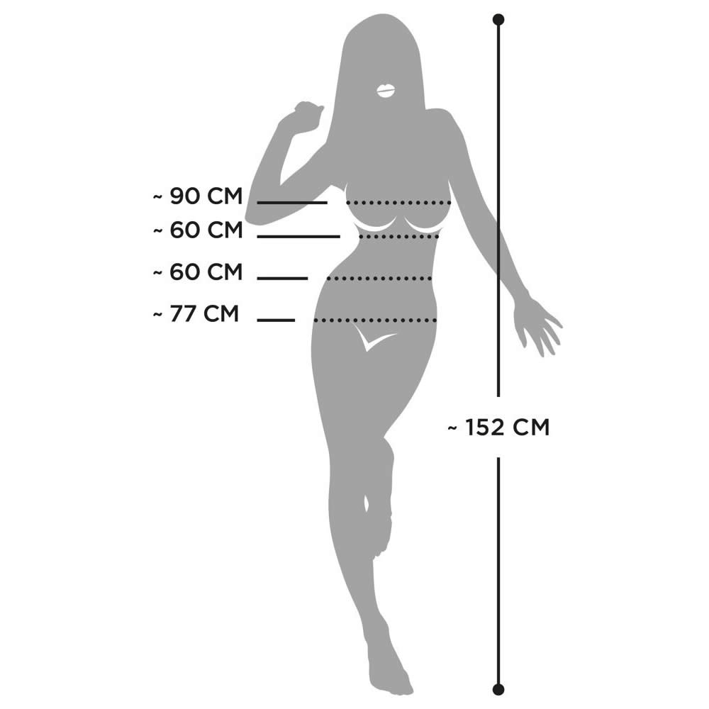 - Omkredse: bryst 90 cm, talje 60 cm, hofter 77 cm