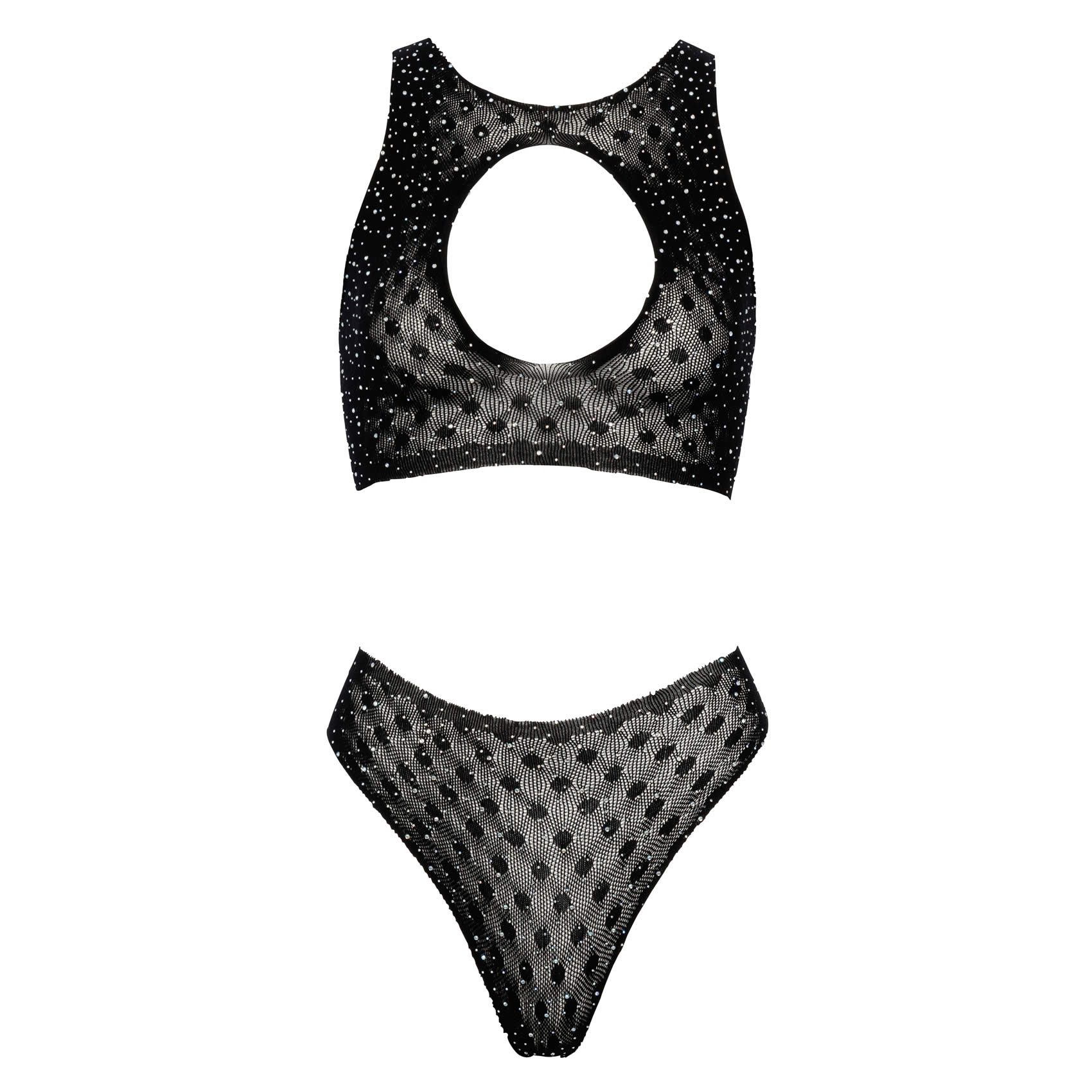Det semi-gennemsigtige stretch materiale afslører en antydning af huden under og skaber en pirrende og forførende effekt. BH’en har et smukt cut-out ved halsudskæringen, der fremhæver décolleté og tilføjer et dramatisk og iøjnefaldende præg. Trussen supplerer BH’en perfekt, fortsætter det funklende smykkesten-motiv og giver et sammenhængende, luksuriøst look. Begge dele er sømløse, uden fremtrædende kanter, hvilket sikrer en glat pasform, der føles blød mod huden.