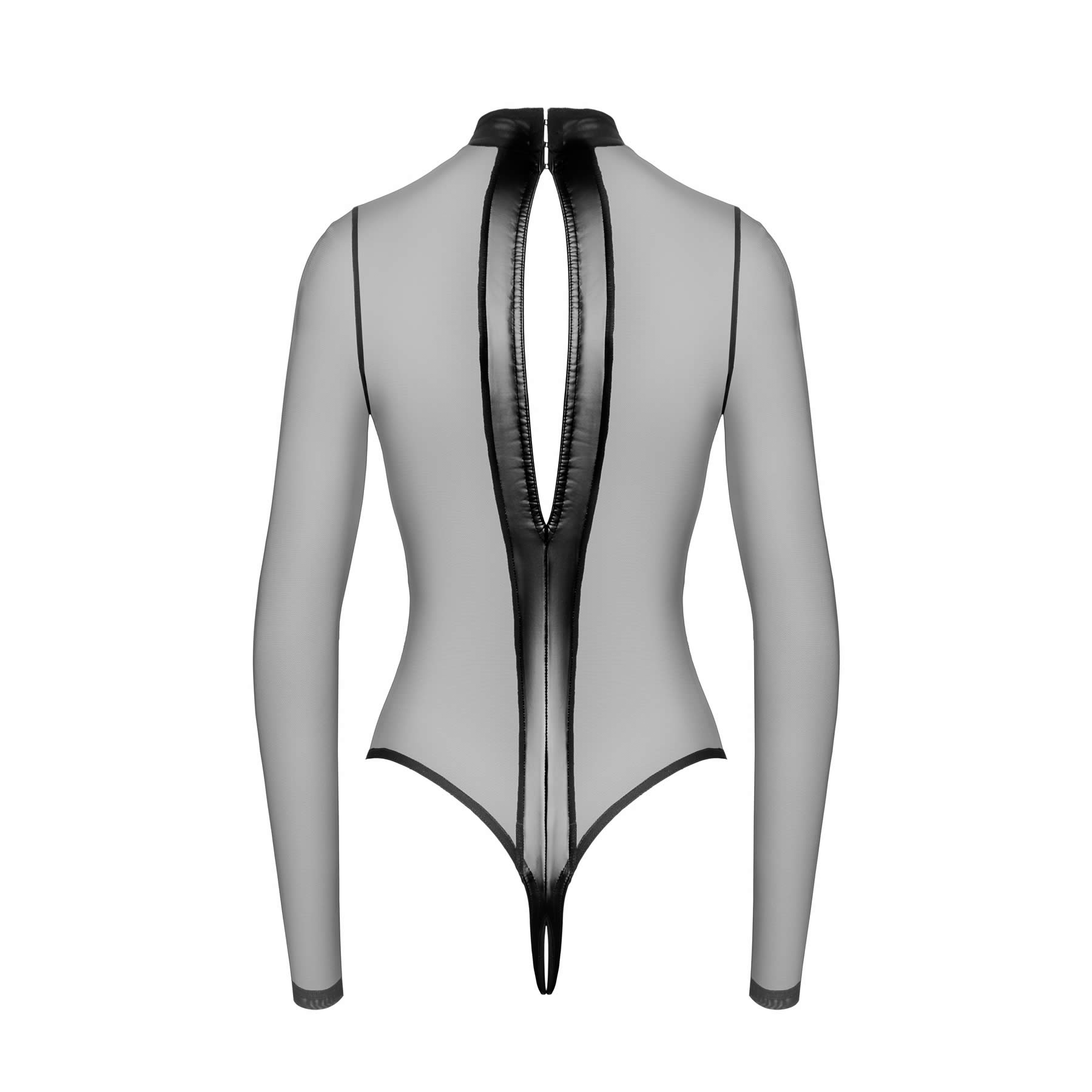 De lange ærmer og det elastiske materiale giver fri bevægelighed, mens kombinationen af transparent og wetlook-materiale sikrer, at du føler dig selvsikker og uimodståelig. Uanset om den bæres alene som statement-piece eller sammen med andre lingeri-elementer, leverer Noir Body med Wetlook Kors et look, der er både forførende og sofistikeret.