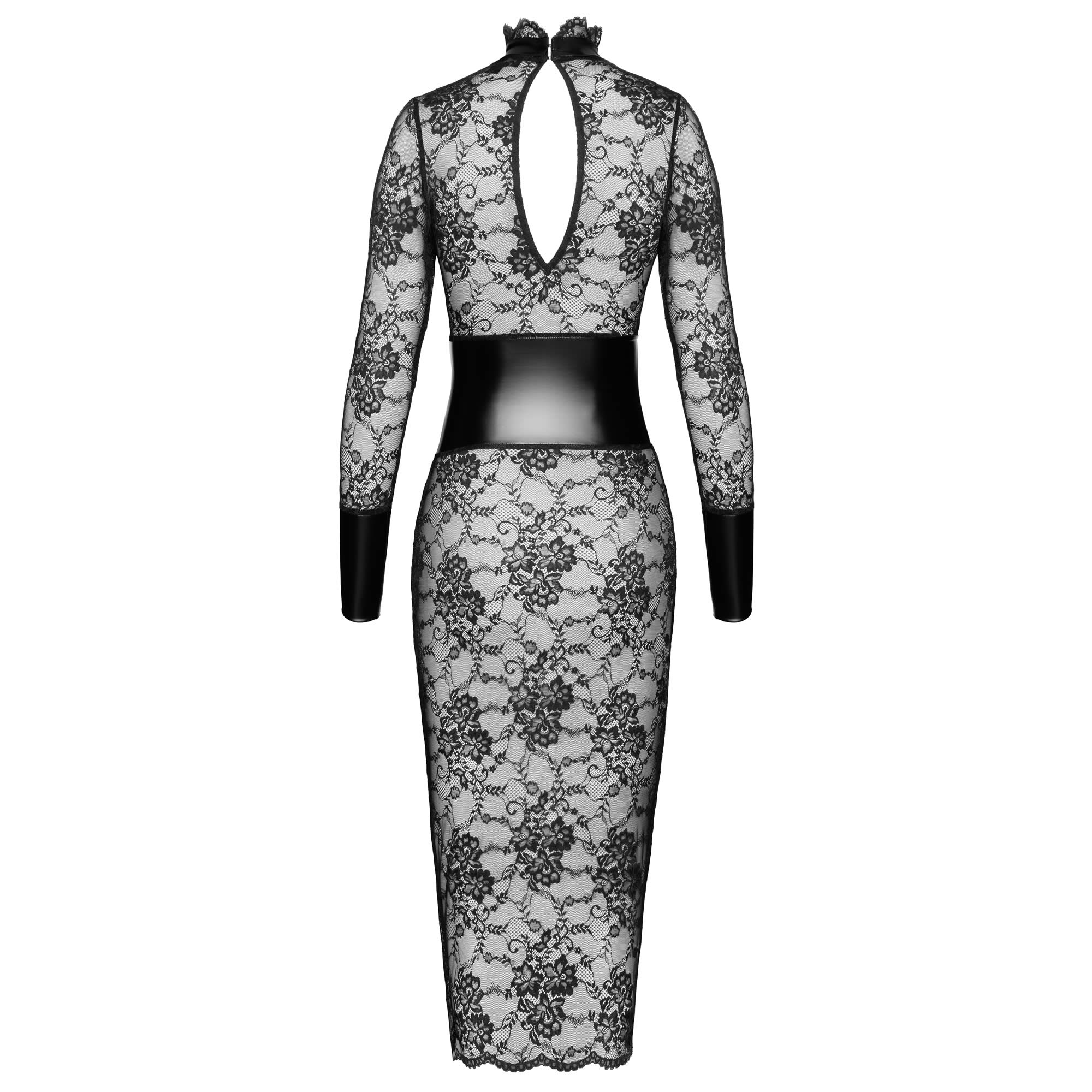 Træd ind i en verden af raffineret sensualitet med Noir Kink Royal Blondekjole med Talje Corsage i Sort. Denne iøjnefaldende langærmede midi kjole er skabt til dig, der elsker elegante silhuetter med et tydeligt og dristigt twist. Den er fremstillet i delikat, transparent blonde og kombineret med markante power wetlook detaljer, som skaber den perfekte balance mellem sofistikation, dominans og selvsikker udstråling.