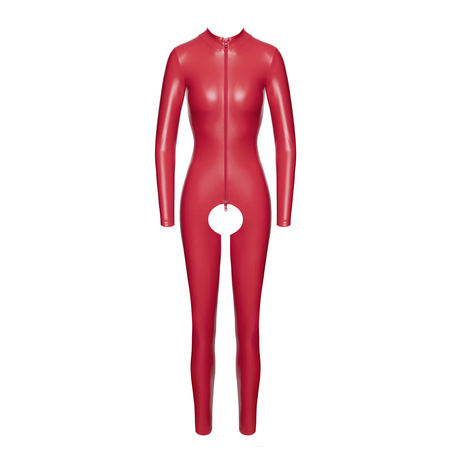 Fremstillet af trendy, kraftigt rød powerwetlook, tiltrækker denne bundløse jumpsuit straks opmærksomhed med sin blanke, iøjnefaldende finish. Det kurvefremhævende design understreger silhuetten og skaber et slankt, dristigt look, der fremhæver dine naturlige linjer. Uanset om du bærer den til en privat aften eller til et dramatisk fotoshoot, udstråler jumpsuiten selvtillid og sofistikation.