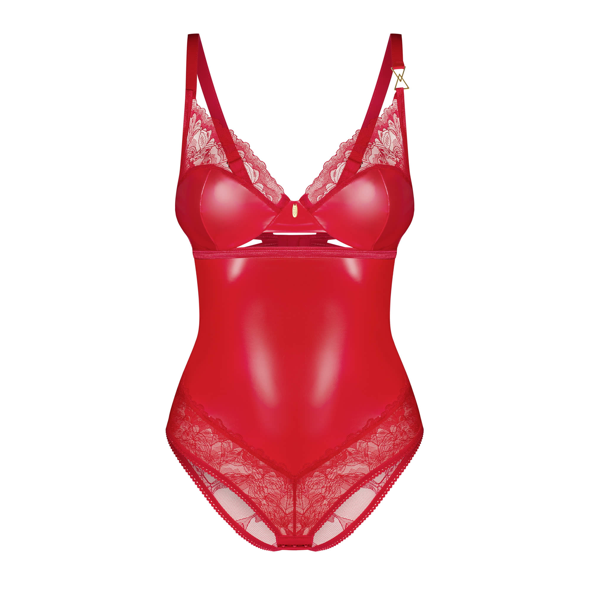 Aliosa-bodyen er lavet af blødt, elastisk rødt wetlook-materiale, som giver en blank, glansfuld finish. Kombineret med delikate, transparente blomsterblonde skabes en smuk kontrast mellem teksturer, der fremhæver kroppens naturlige kurver samtidig med, at den forbliver elegant og feminin. Blondedetaljerne tilfører et romantisk og forførende touch, hvilket gør bodyen perfekt til intime aftener eller særlige lejligheder, hvor du vil efterlade et varigt indtryk.