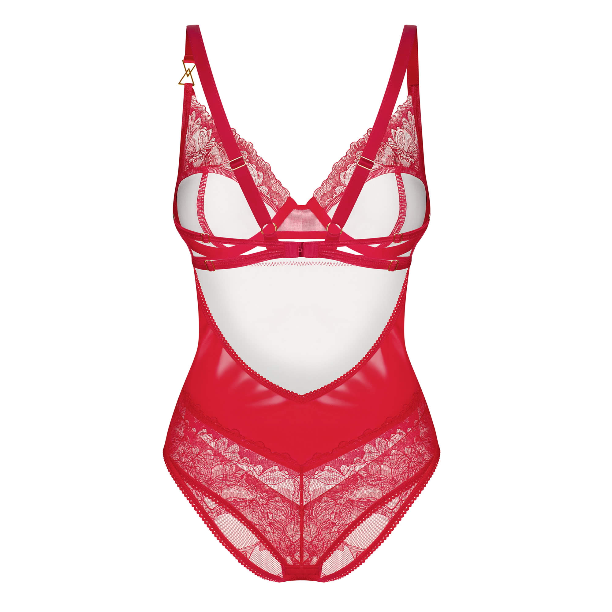 Dens bøjle BH skåle giver løft og støtte og fremhæver udskæringen for en sexet og selvsikker silhuet. En diskret guldfarvet dekorativ detalje er placeret mellem skålene og på en af stropperne, hvilket tilføjer et luksuriøst og sofistikeret præg. De justerbare stropper sikrer en perfekt pasform til forskellige kropstyper, mens den bageste hægte og krog lukning i skridtet gør det nemt at tage bodyen af og på uden at gå på kompromis med stilen.