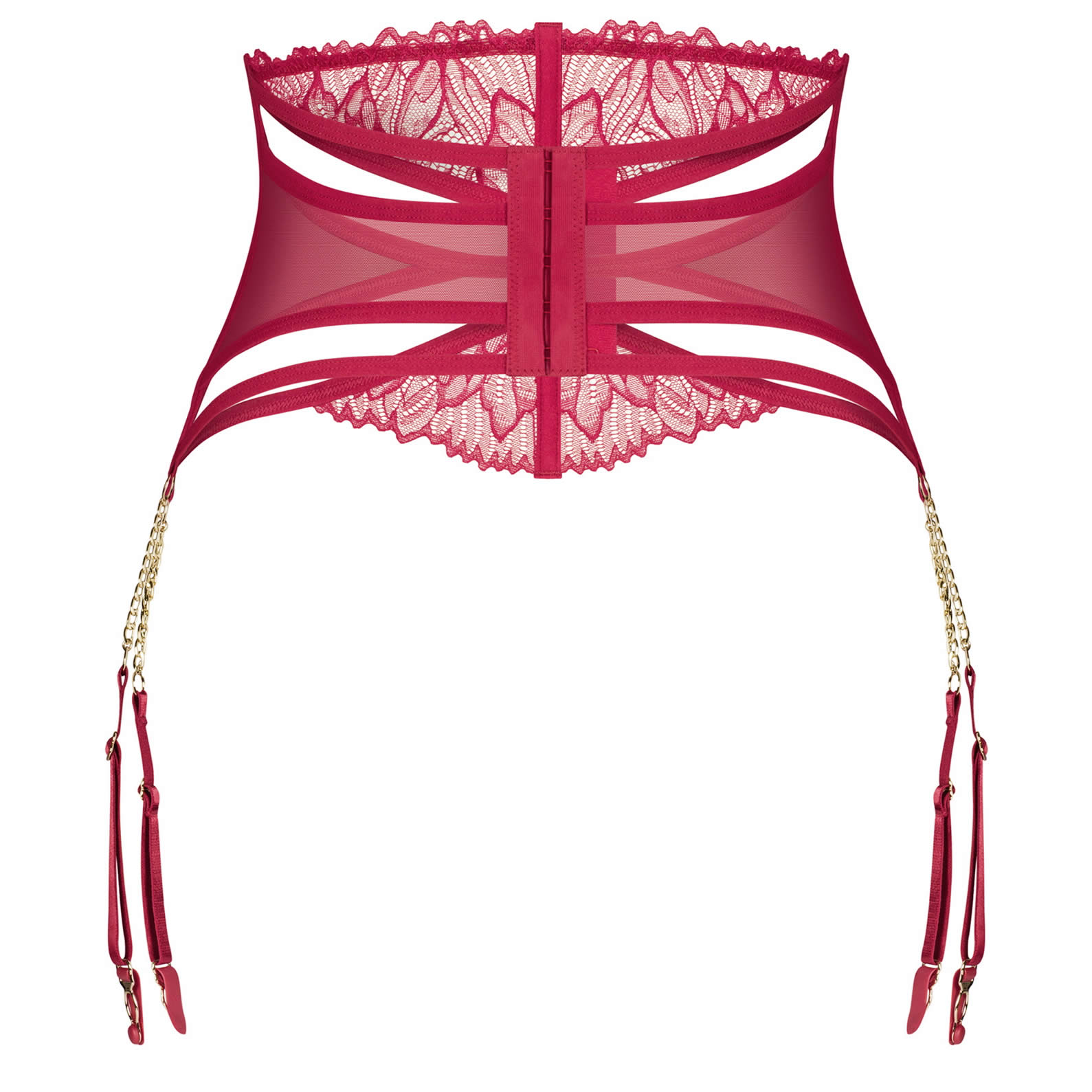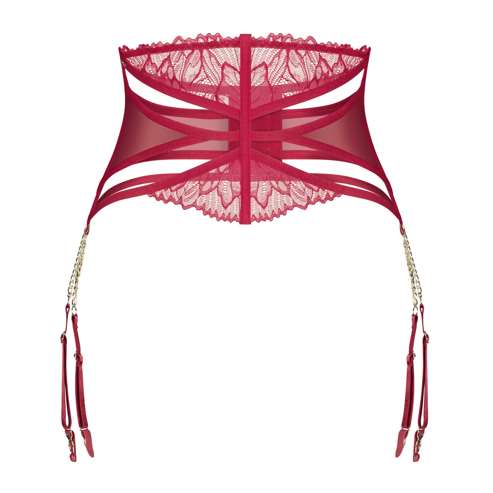 Matildea-hofteholderen er fremstillet i en delikat kombination af transparent net-tul og fin blonde. Hvilket skaber en visuelt forførende effekt, der fremhæver dine kurver. Guldfarvede detaljer og kæder forbinder de justerbare seler med hofteholderen, hvilket både giver et sofistikeret præg og et strejf af legesyg glamour. Den kontrastfulde kombination af dyb rød blonde, blødt net-tul og skinnende gulddetaljer gør denne hofteholder til et iøjnefaldende centerpiece i ethvert lingeri-look.