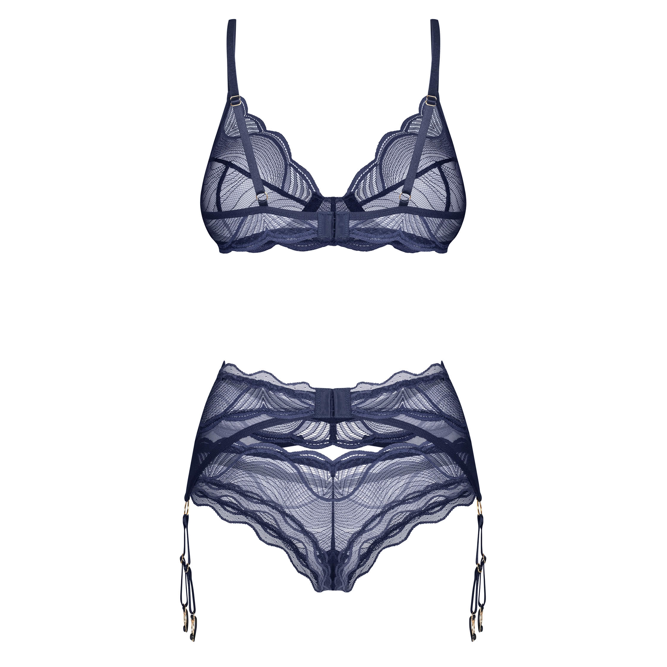 Nightly Blue fremviser en delikat, transparent blondeeffekt i en elegant blå-i-blå farvepalet. Det fine blondemønster tilføjer et strejf af sofistikering og glamour, samtidig med at det afslører akkurat nok til at fange opmærksomheden. De harmoniske blå nuancer skaber et subtilt men slående udtryk, hvilket gør sættet til et unikt og iøjnefaldende valg i enhver lingerigarderobe.