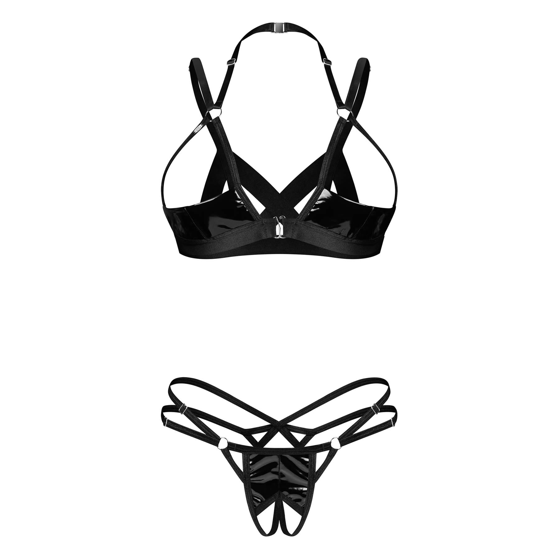 - Detaljer: Open-cup hylde BH, bundløs trusse, skinnende vinyl, sølvfarvede detaljer, lynlås foran og halterneck-lukning, justerbare stropper