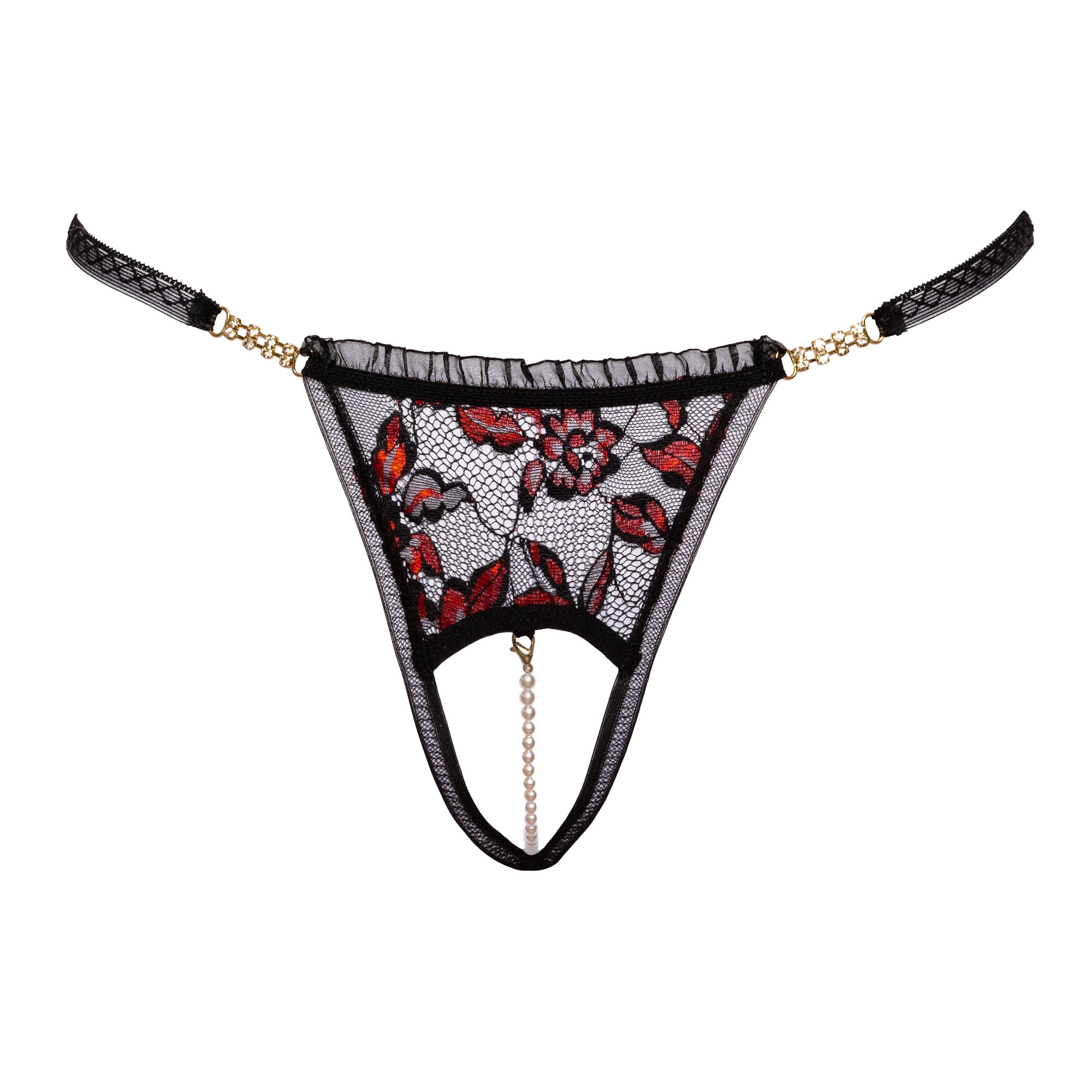 Disse smukke perle trusser i sort og rød er dekoreret med flotte kæder i en smuk guldfarve der gør dem både eksklusive og frække.