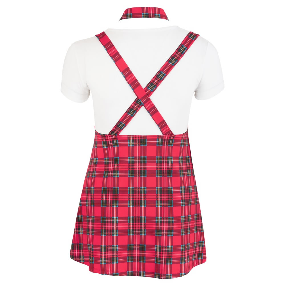 Det frække skolepige kostume består af en kjole i rød ternet med hvid top. Det går rød-ternede seler hen over brystet, som derefter lavet et kryds på ryggen. Sammen med kjolen får du et slips, ligeledes i rød-ternet materiale. Det ternede stof har et klassisk skotsk ternet mønster der er klassisk til skolepige uniformen.