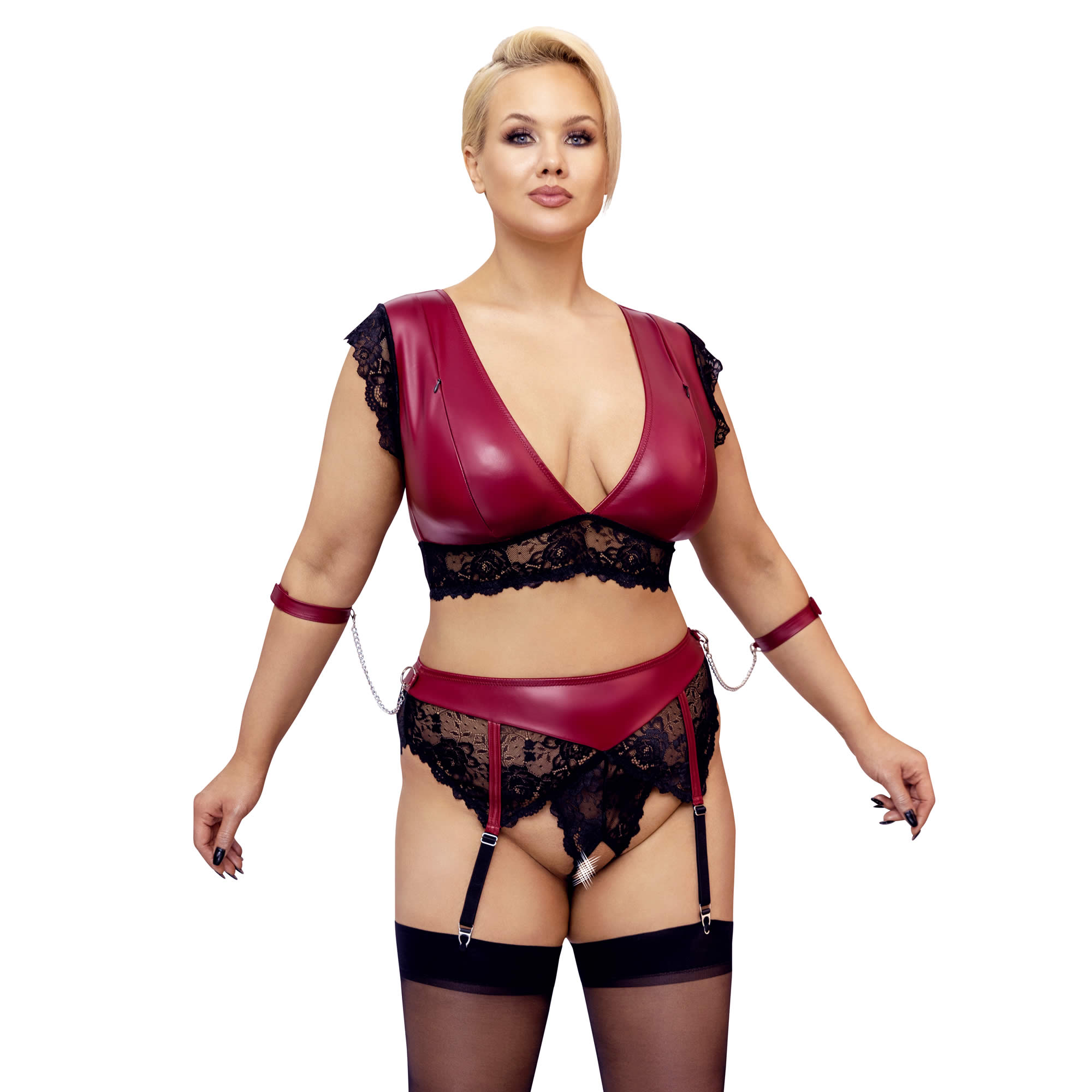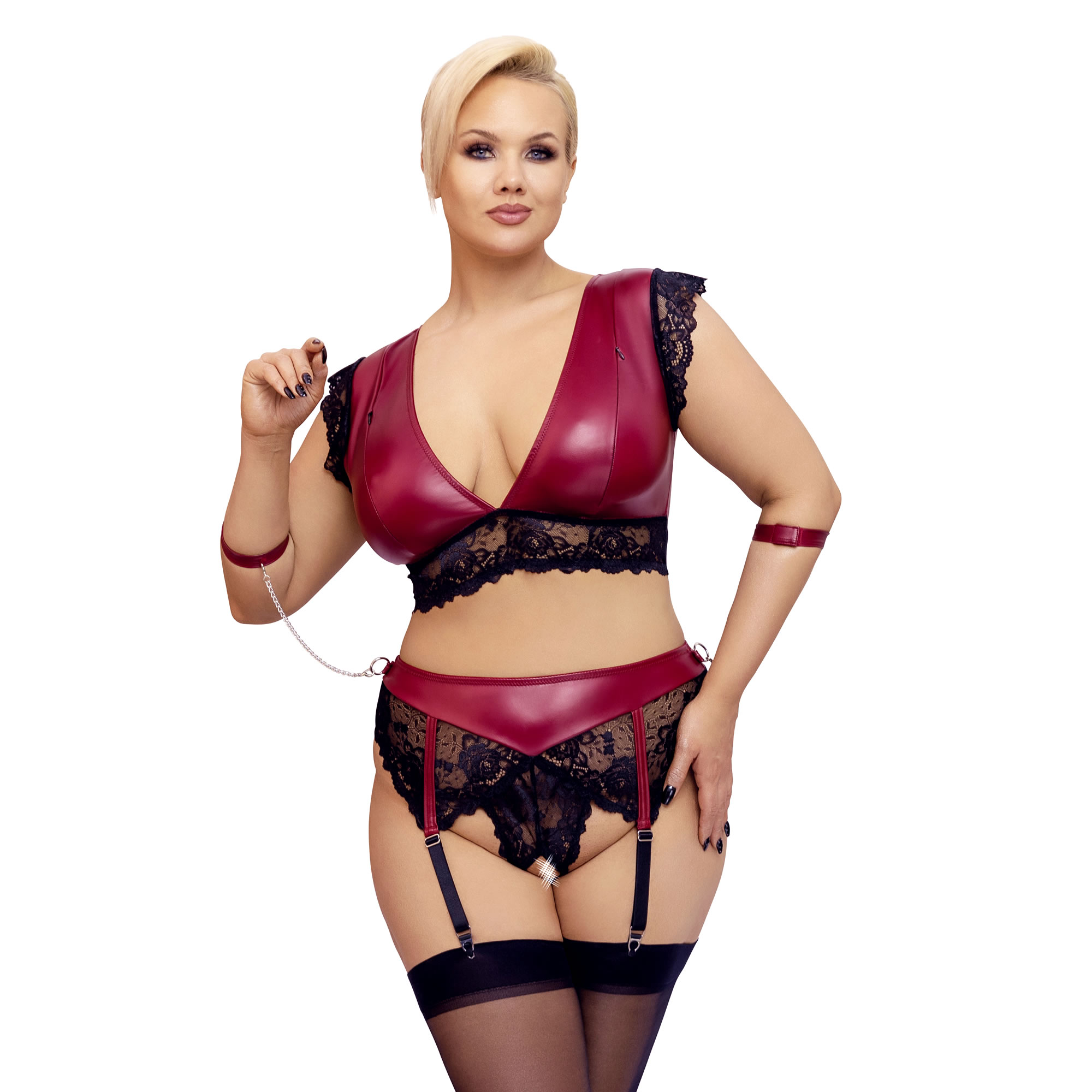 Dette smukke plus size wetlook og blonde lingeri rød med håndlænker er en elegant symbiose mellem kink og romantisk elegant.