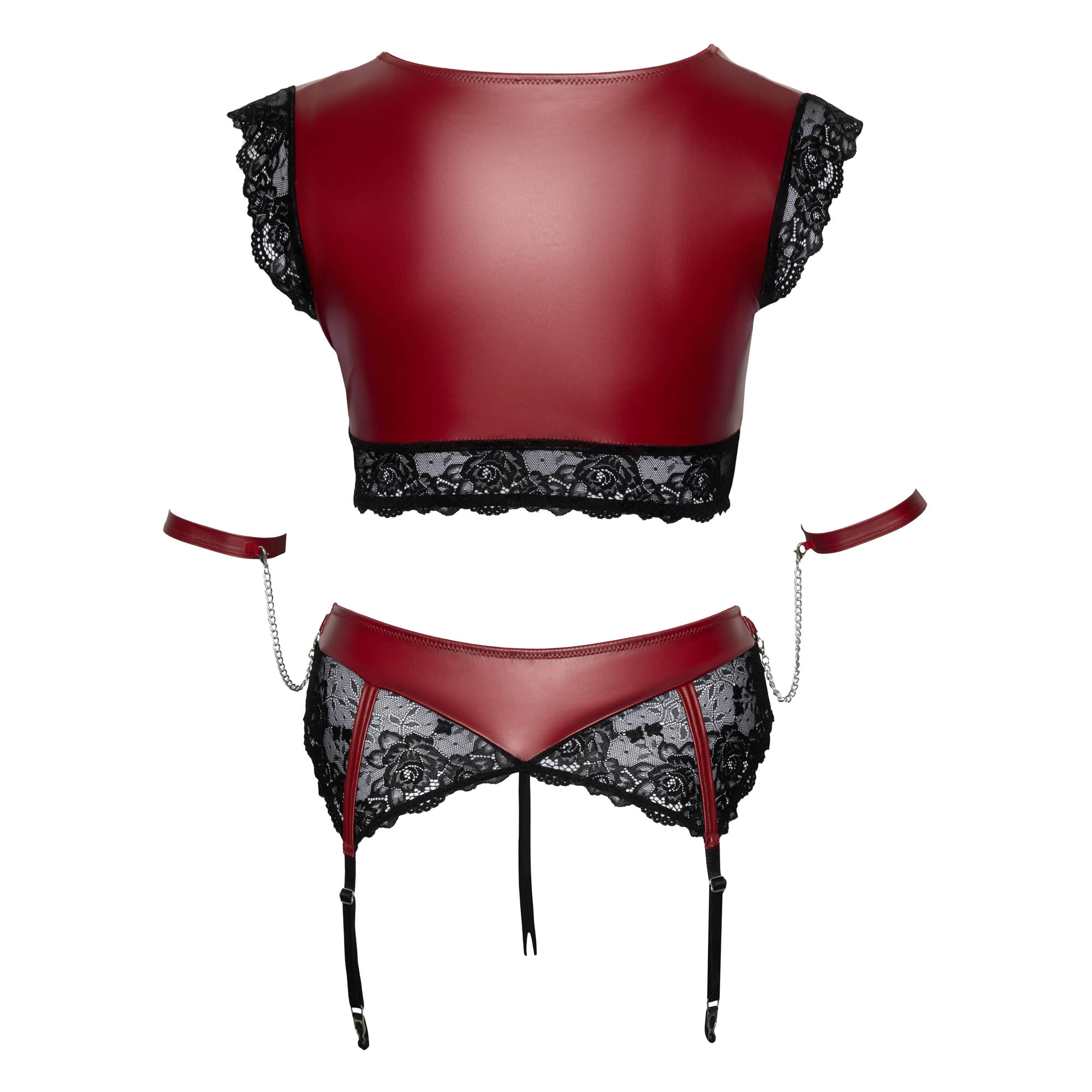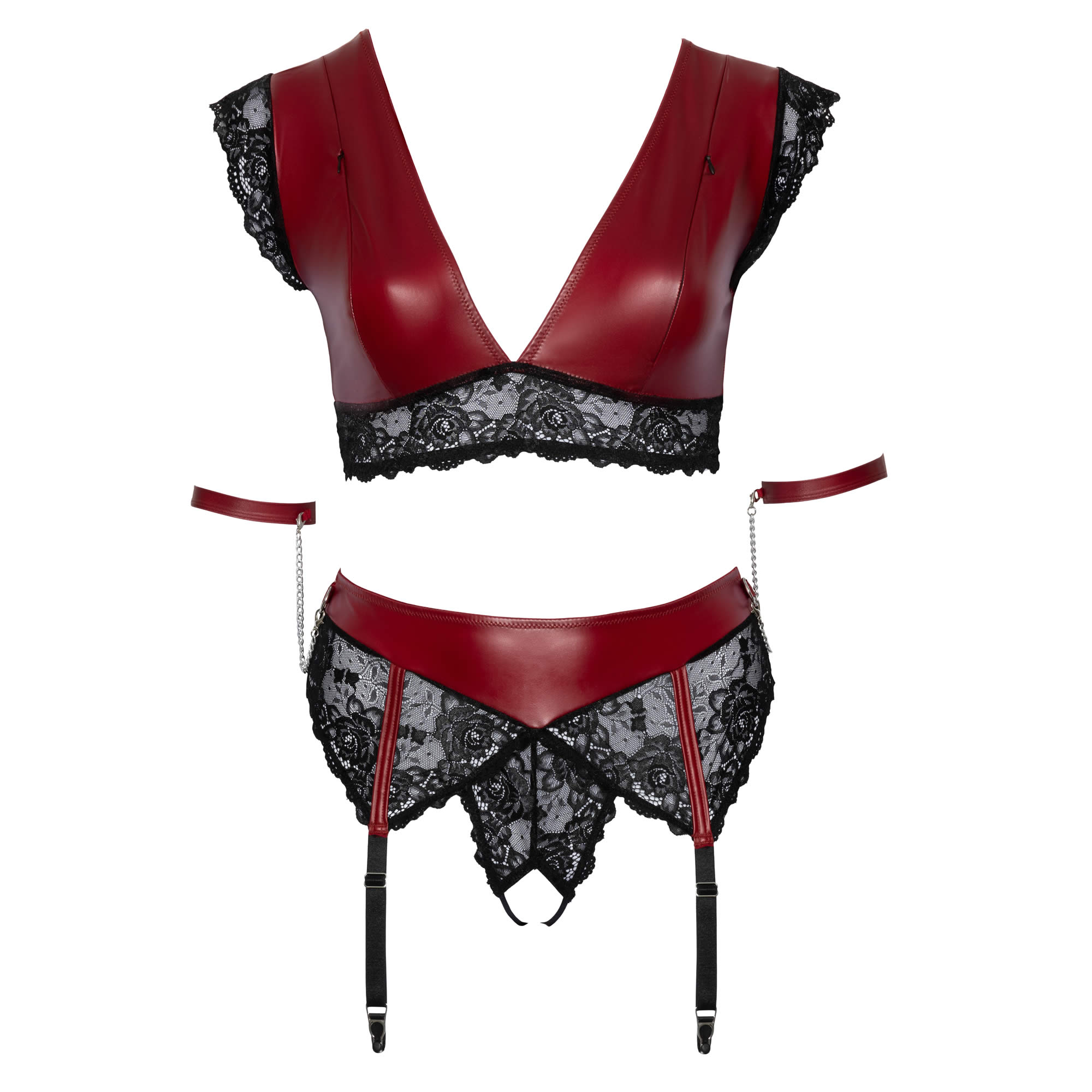 BH’en er af type bralette med en bred blondekant i bunden. Den har små blondekanter ud over skuldrene. Dertil kommer at den har en lækker forførende og dyb udskæring. Trusserne er også i et mix af blonder og wetlook. Selve taljen er i rød wetlook og trusserne er så i blonder. Trusserne har på siderne små ringe til de frække armlænker og 4 strømpeholdere der kan justeres i længden. Trusserne er bundløse med en åbning i bunden. De 4 armlænker kan undlades hvis man ønsker det. De er sat fast med små kæder der har karabinhager.