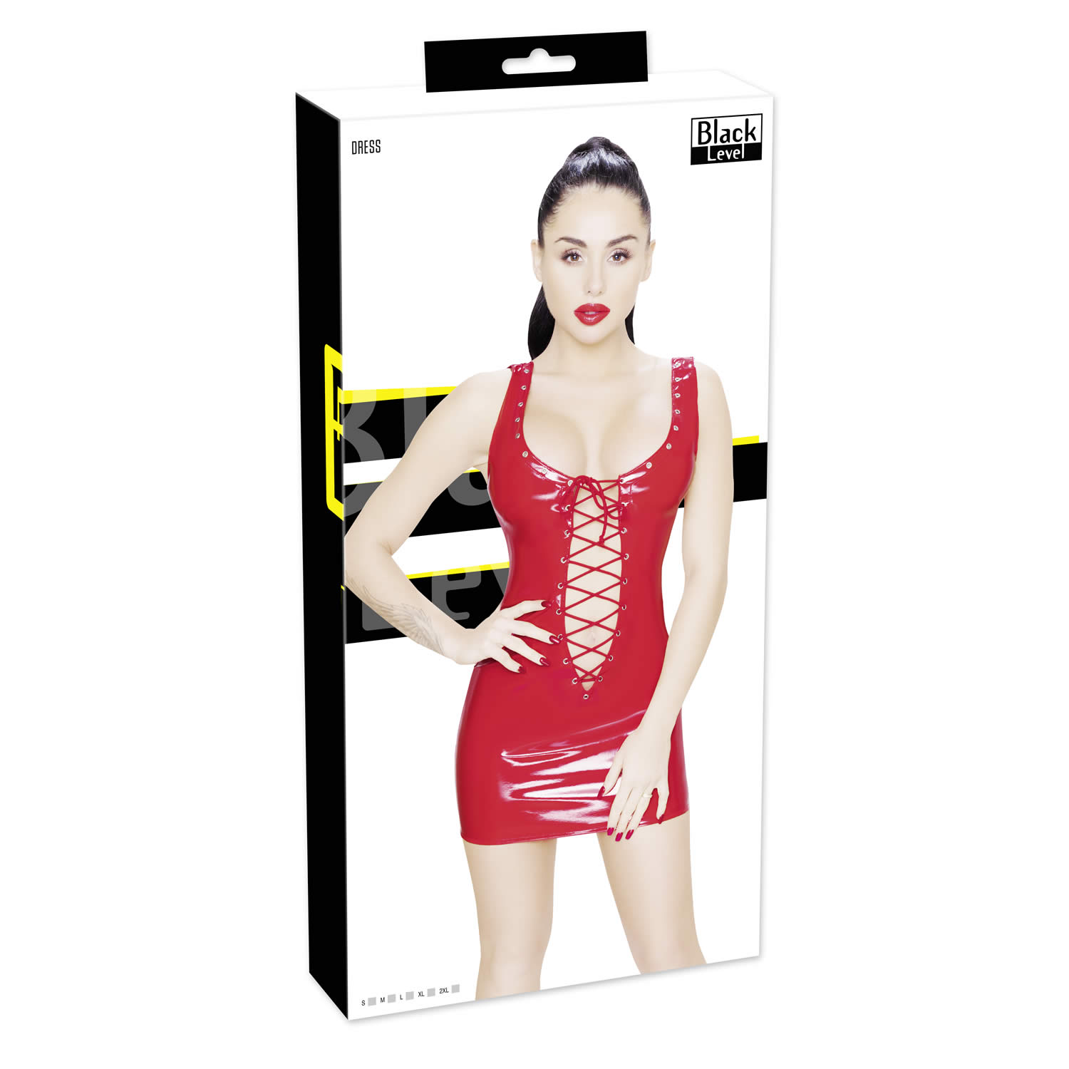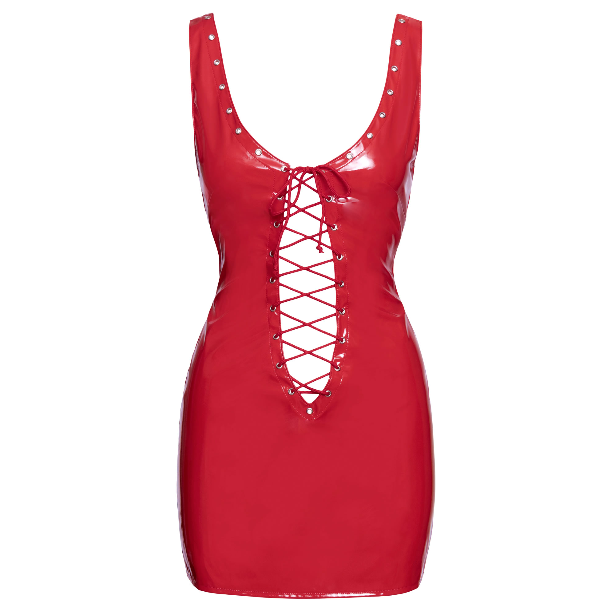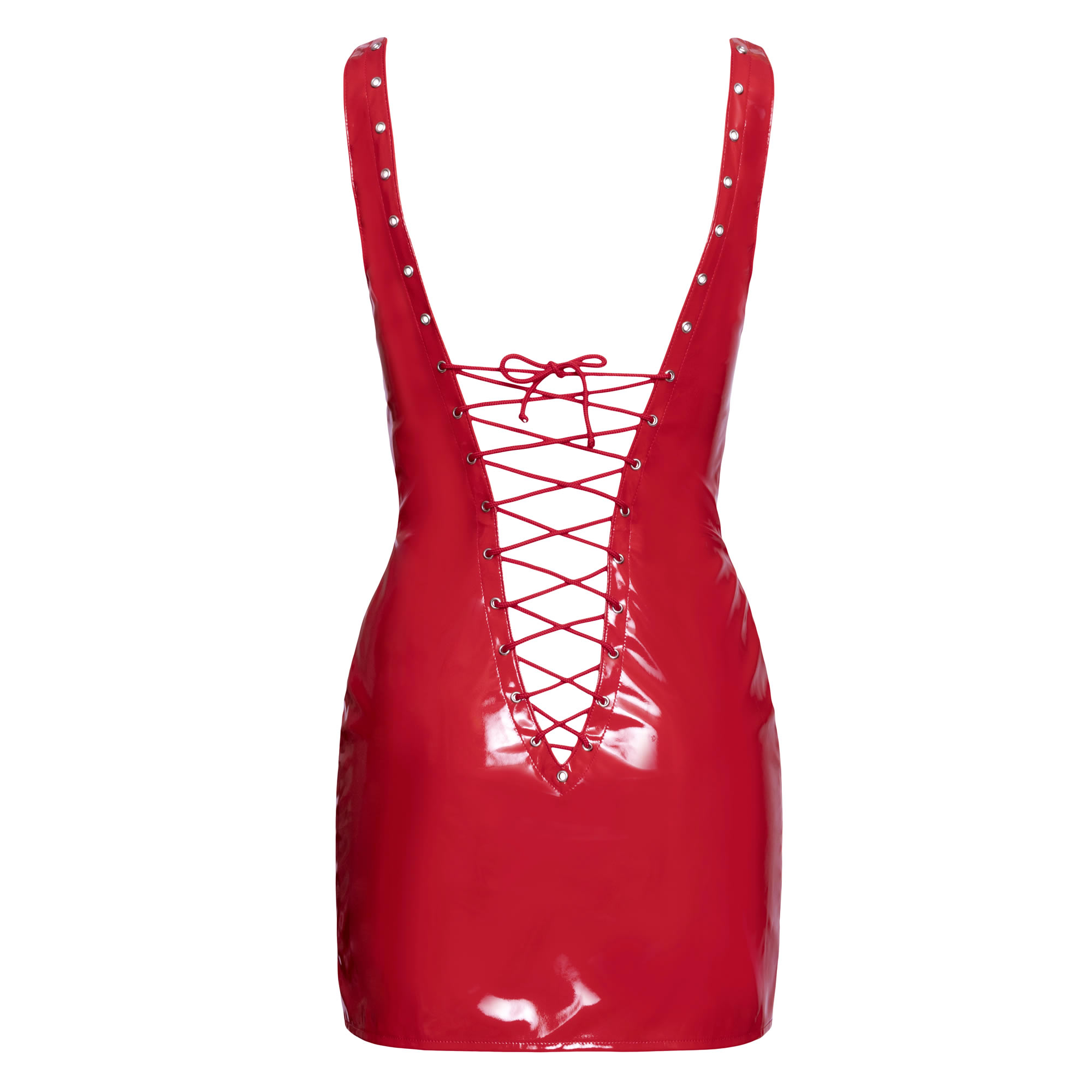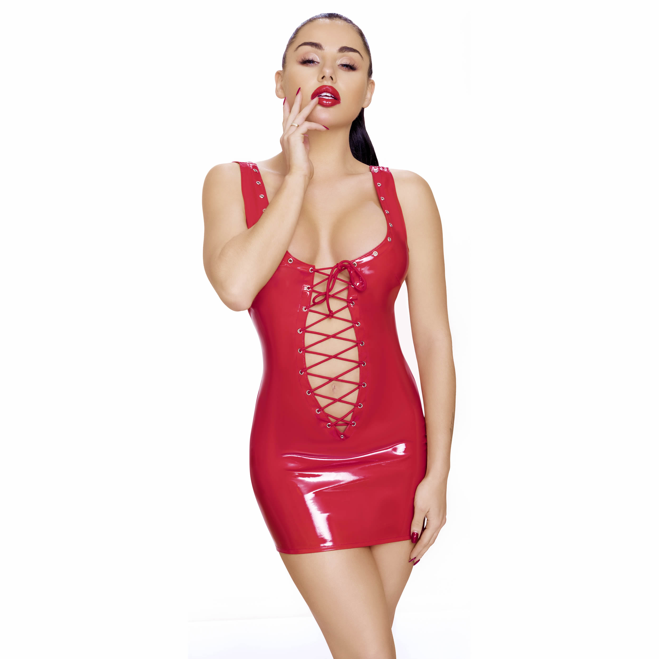 Rød lakkjole med snører der giver en smuk og fræk udstråling. Den har dyb udskæring både foran og bagpå. Udskæringerne holdes sammen af snører og det tætsiddende snit viser alle hendes feminine attributter skinnende smukt frem. Kjolen er lavet af 100% polyester overtrukket med polyuretan.
