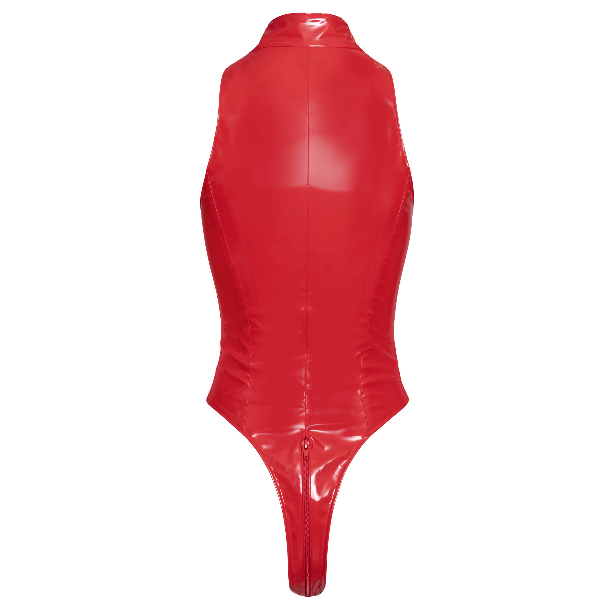 Hot rød vinyl body med 2-vejs lynlås og krave.