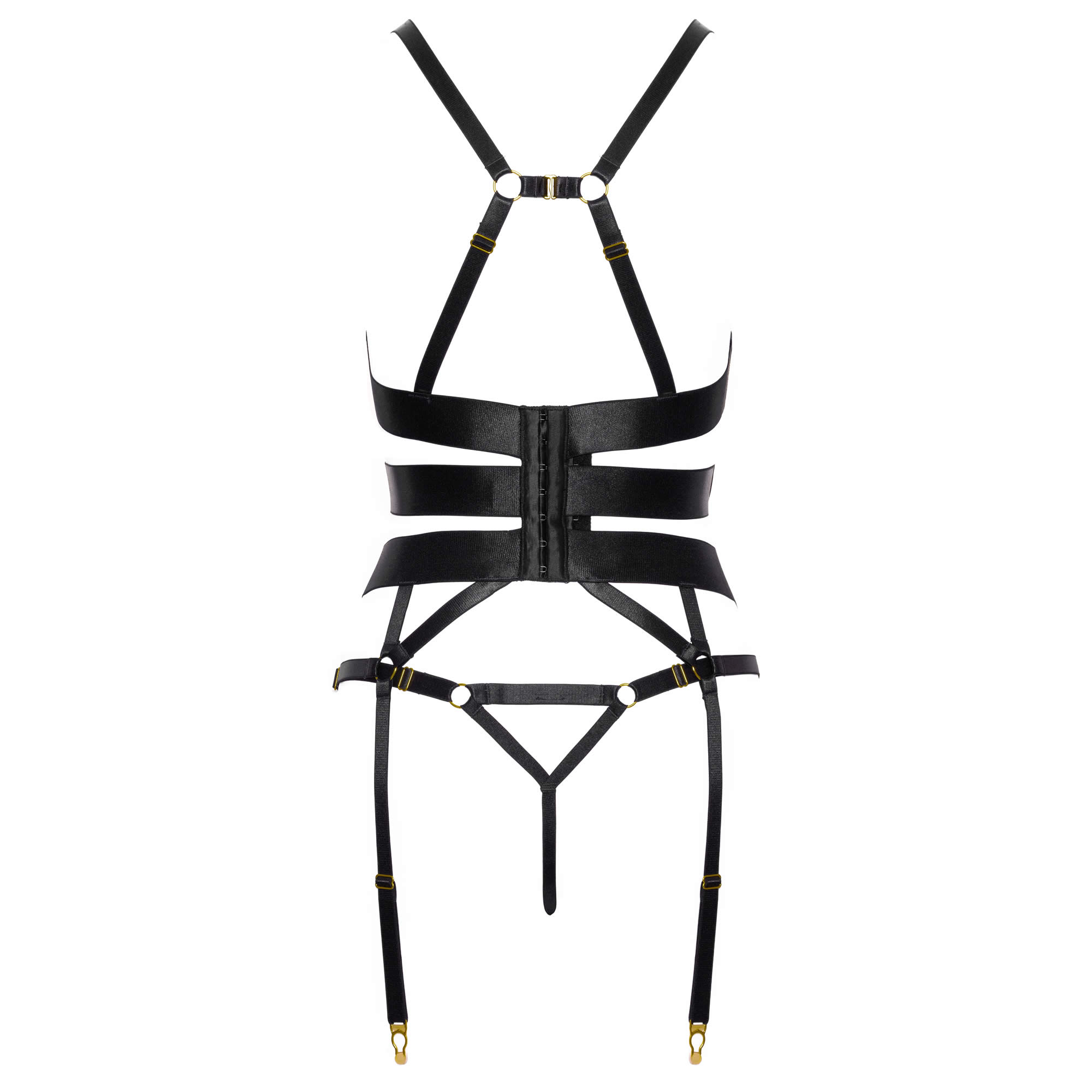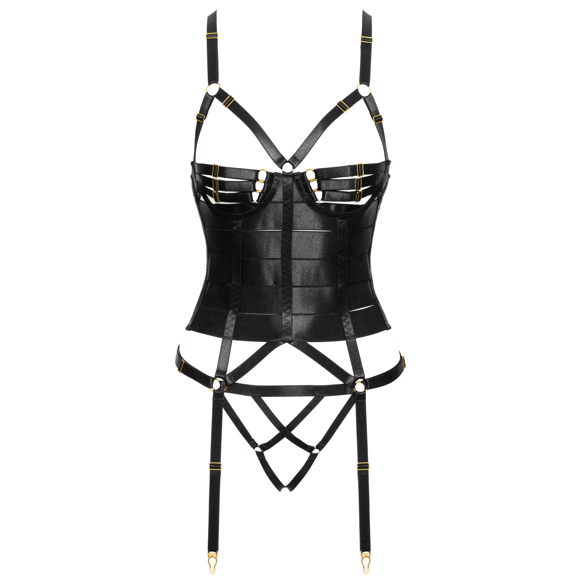 Den medfølgende trusse er bundløs, hvilket giver et ekstra lag af sexy, samtidig med at sættet forbliver elegant og stilfuldt. Corsagen har detaljerede stroparrangementer og små cut-outs, der skaber et legende og provokerende design, som tiltrækker opmærksomhed fra alle vinkler. Uanset om det er til private stunder eller som del af et dristigt outfit, udstråler dette sæt både selvtillid og sofistikeret sensualitet.
