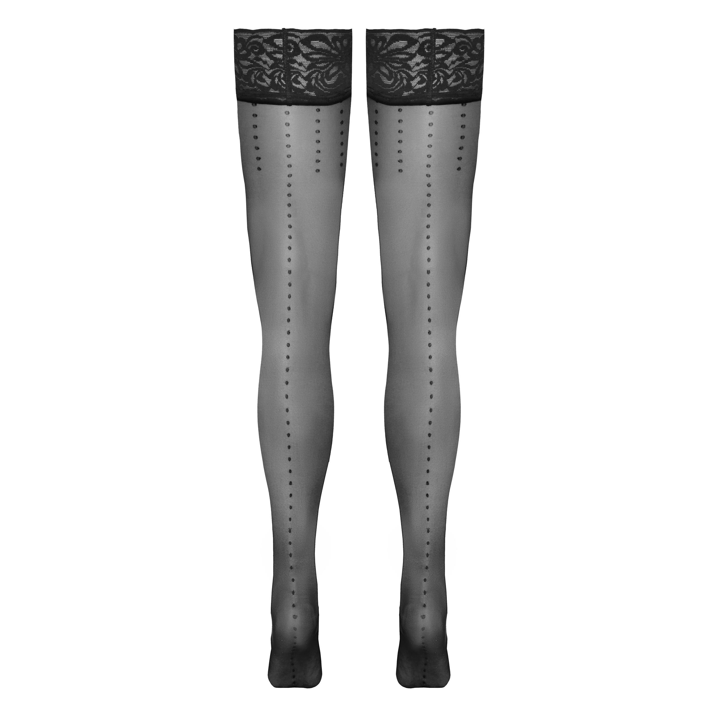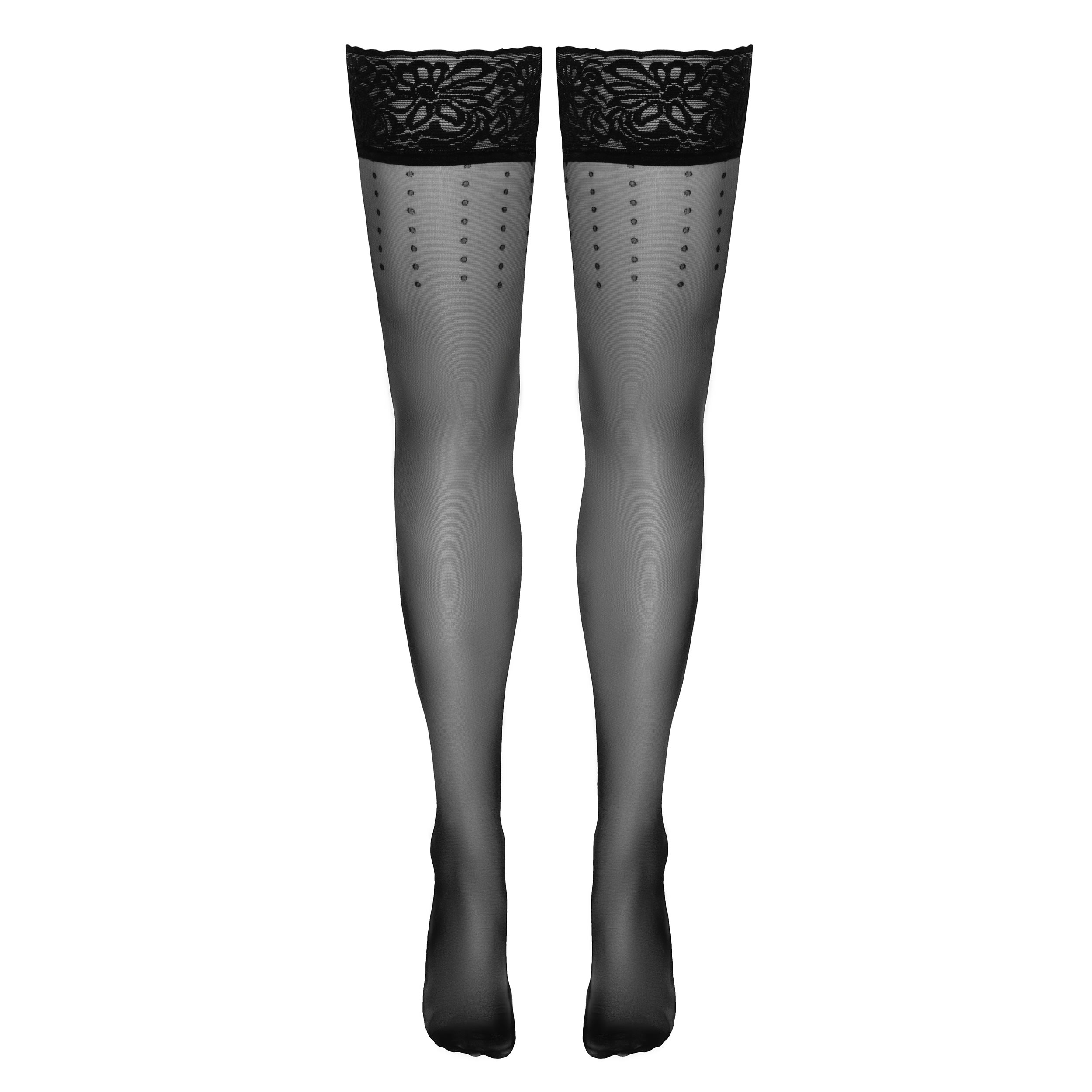 Disse fine sorte selvsiddende strømper med deres elegante prikker og silkeagtige lethed, giver dig endnu smukkere ben. Prikkerne står elegant på linje hele vejen rundt om dine lår og som en bagsøm.