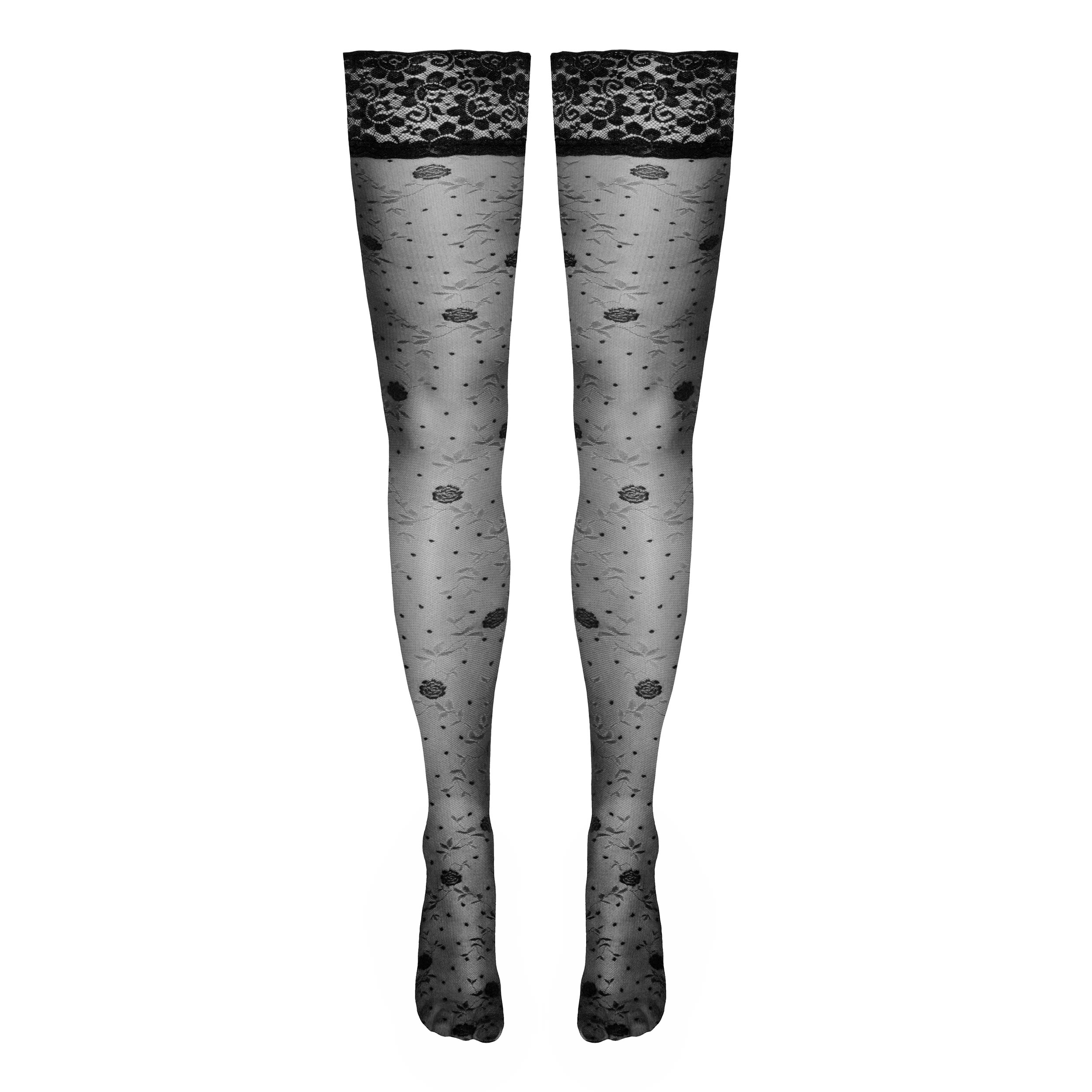- Snit & materiale: Sorte selvsiddende strømper med fint rosenmønster.