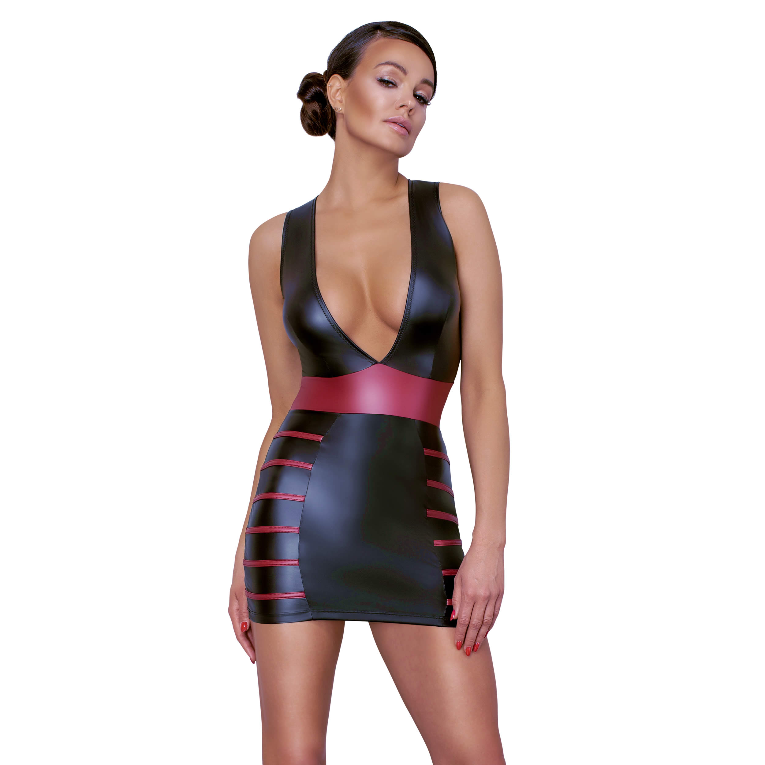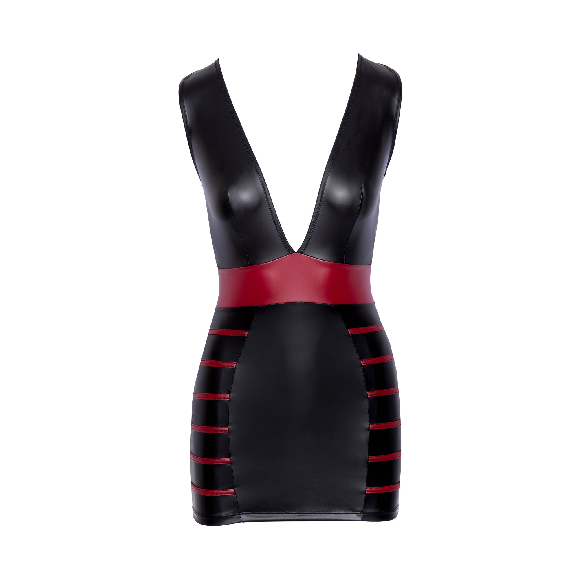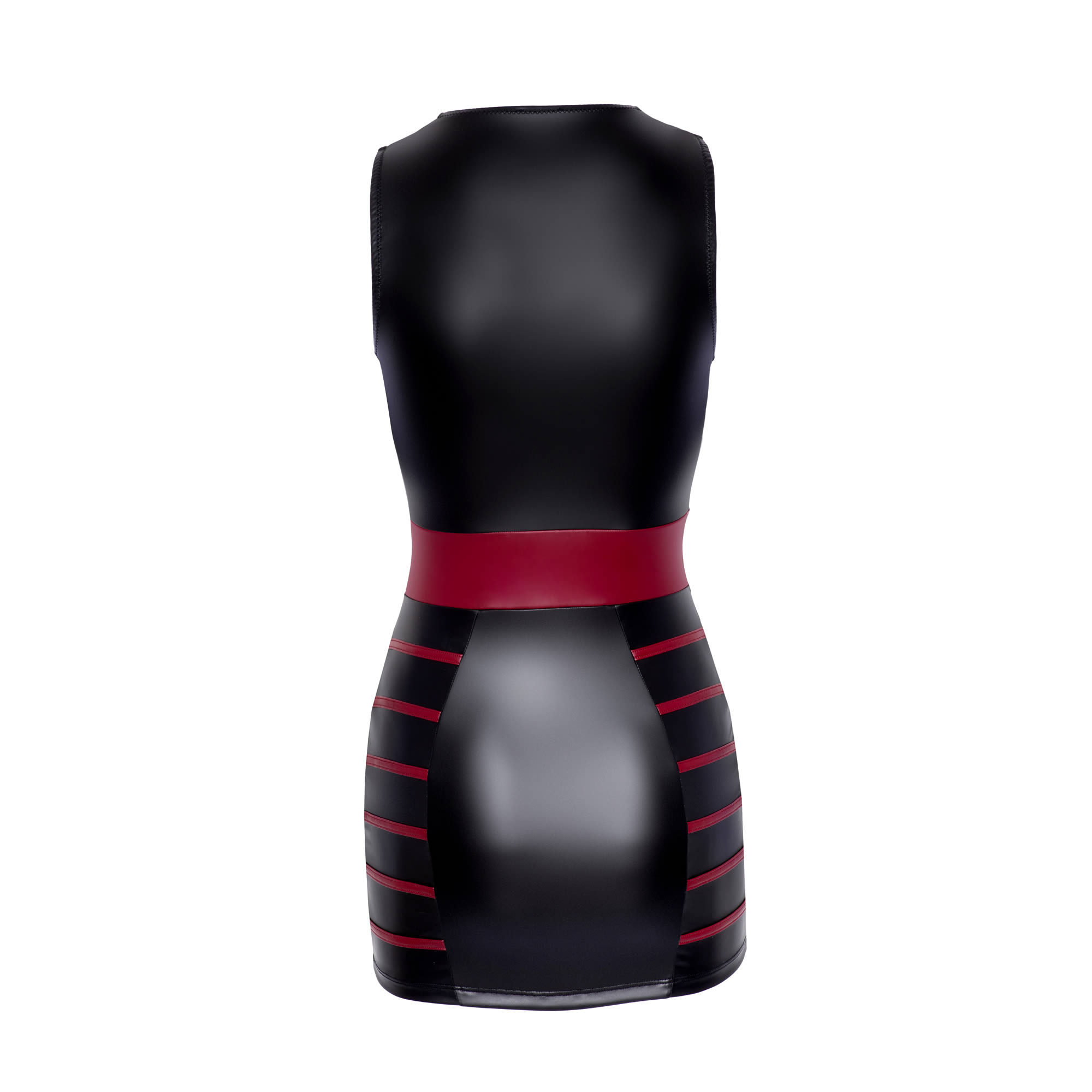 Raffineret sort wetlook kjole med røde striber og talje af rød wetlook der understreger dine feminine kurver. Derudover sætter den ekstra dybe udskæring dit décolleté spændende i scene.