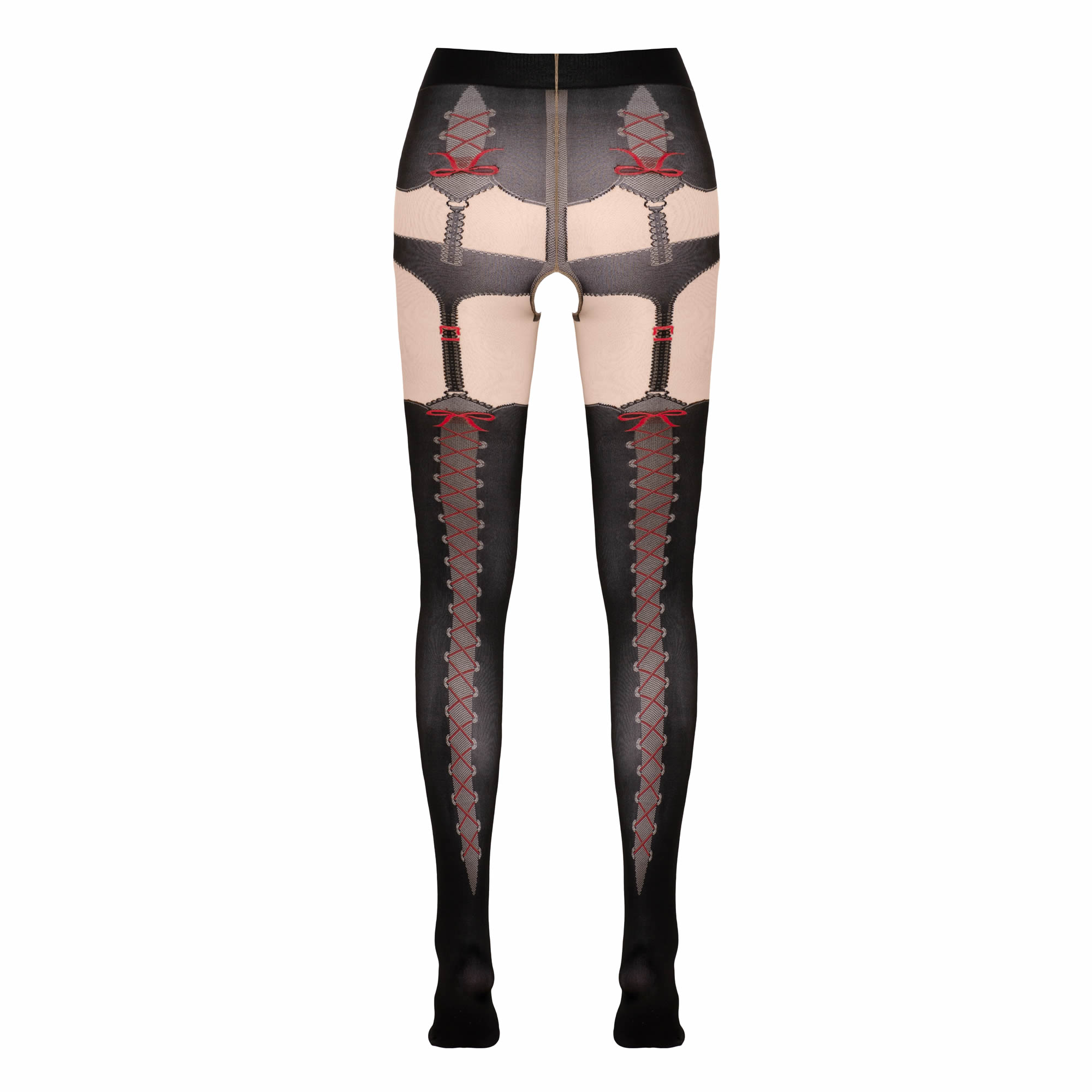 Disse elegante og raffinerede strømpebukser med snøre og hofteholder effekt vil gøre din ben spektakulær smukke og forførende. Strømperne er et orgie af smukke detaljer. Ikke alene ser det ud som strømper med hofteholder. Det ligner en eksklusiv nostalgisk hofteholder der er 2-delt. Strømperne ser ud som om de har forførende snører bagpå. Dette er strømperne der giver dig elegante, frække og smukkere ben.