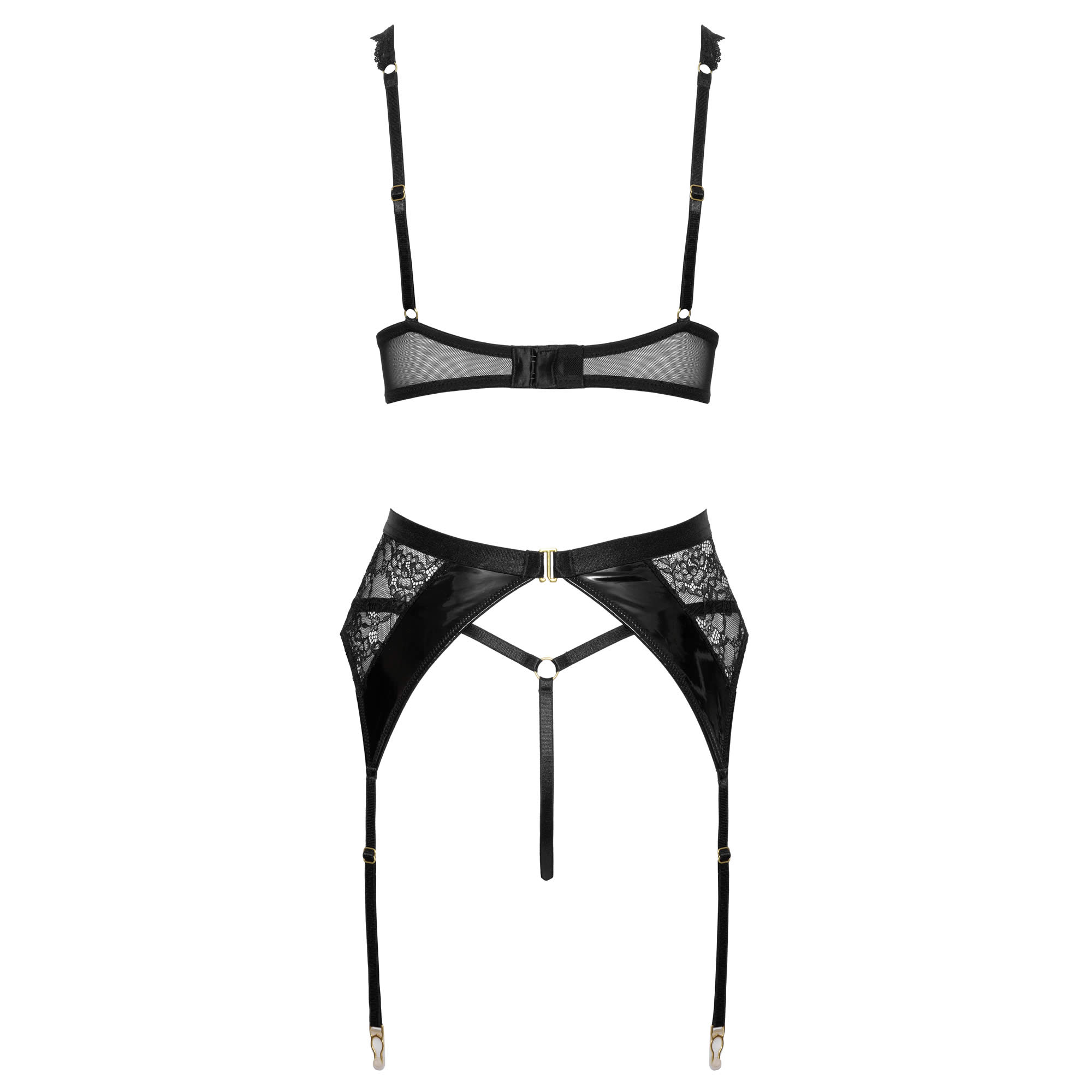 Hvert element af sættet er designet til justerbarhed og optimal pasform. BH’en har justerbare cup- og skulderstropper samt hægte bagpå, og de let polstrede vinylskåle giver både løft og støtte. Hofteholderen er elastisk med hægte bagpå og en dekorativ ring foran, mens strømpeholderstropperne kan justeres i længden, så de passer til både strømper og krop. Det detaljerede design sikrer, at hver del sidder perfekt, fremhæver dine kurver og samtidig er behagelig at have på.