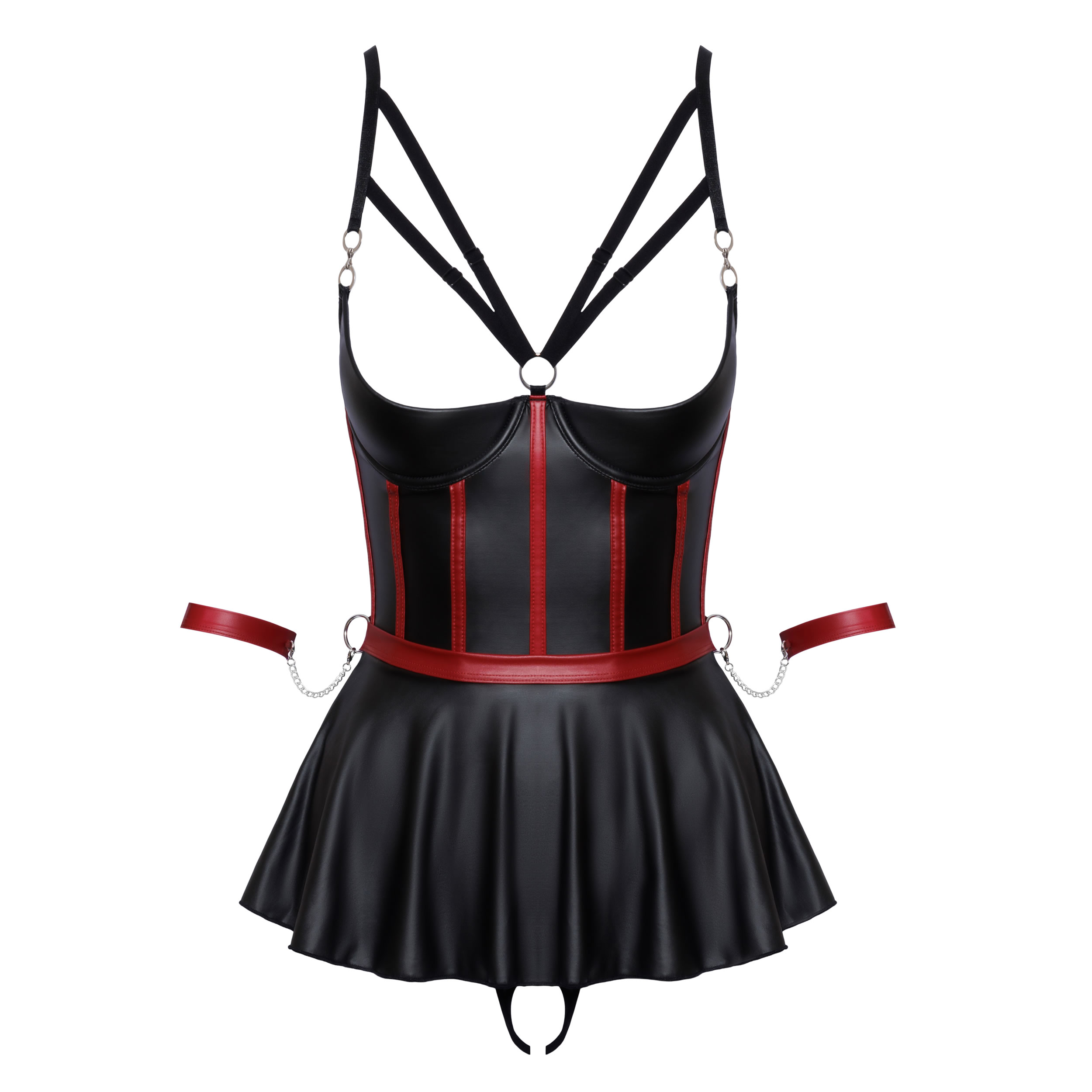 Longline wetlook BH med plisseret nederdel, bundløs g-streng og 2 armmanchetter i et sæt. Lavet i ædelt sort wetlook med røde kontrastfarvede striber. Dertil et talje fremhævende look og sølvfarvede detaljer. Sættes longline BH har let polstrede bøjleskåle. der ikke ser frække ud men også giver et løft til barmen. Dermed bliver de perfekt præsenteret og giver et frækkere look.