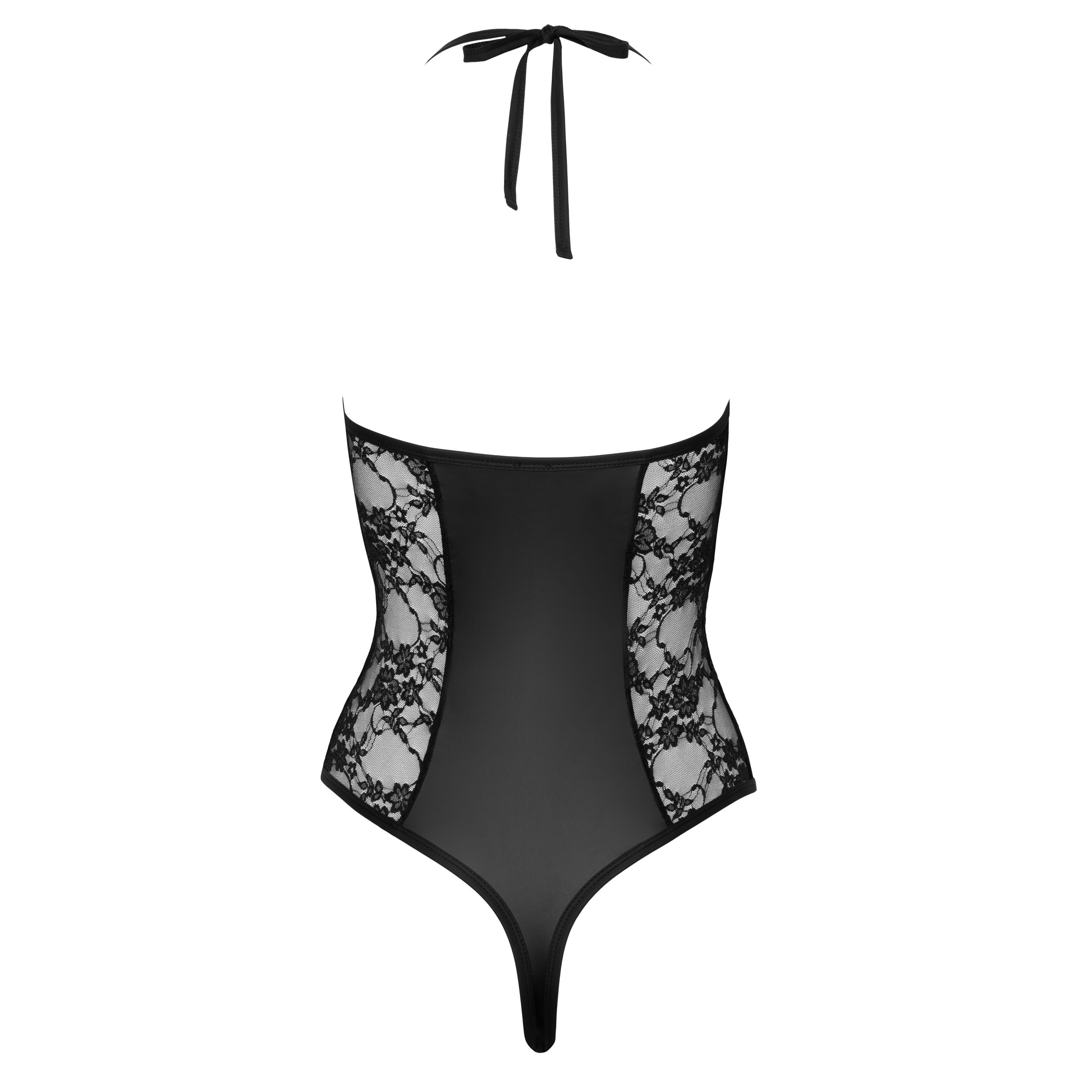Dybt tilspidset dekolletage med krydsede strækbånd. Halterneck bindes i nakken, ryggen forbliver fri. Ekstra høje benudskæringer viser bagdelen og benene bedst muligt frem. Med trykknaplukning i skridtet – praktisk og forførende på samme tid.